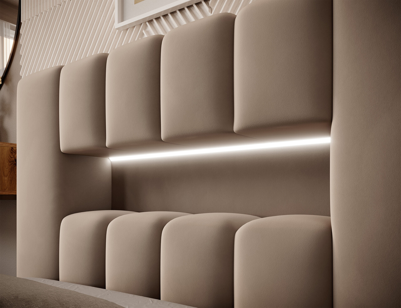 Un detaliu exclusivist al patului Lamica este tablia cu iluminare LED care creeaza o atmosfera relaxanta si placuta. Aceasta combinatie intre modernitate si rafinament face din patul Lamica alegerea ideala pentru cei care isi doresc un dormitor elegant si functional.