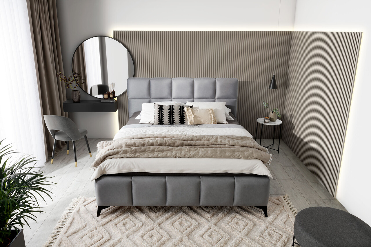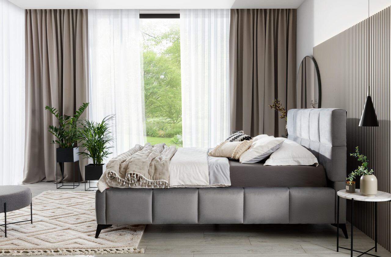 Tapiteria sofisticata a patului Mist adauga caracter si stil, integrandu-se perfect intr-un decor contemporan. Mobilierul este disponibil in trei dimensiuni ale suprafetei de dormit – 140x200 cm, 160x200 cm si 180x200 cm – permitandu-va sa alegeti varianta ideala pentru spatiul dumneavoastra.