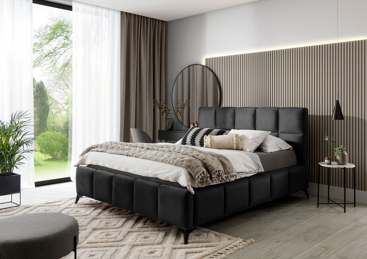 Picioarele elegante din otel negru, cu o inaltime de 13.5 cm, creeaza impresia ca patul pluteste, contribuind la un efect vizual de amploare si aerisire a camerei. In plus, patul Mist este dotat cu un spatiu generos de depozitare pentru lenjeria de pat, o solutie inteligenta pentru optimizarea spatiului si mentinerea ordinii in dormitor.
