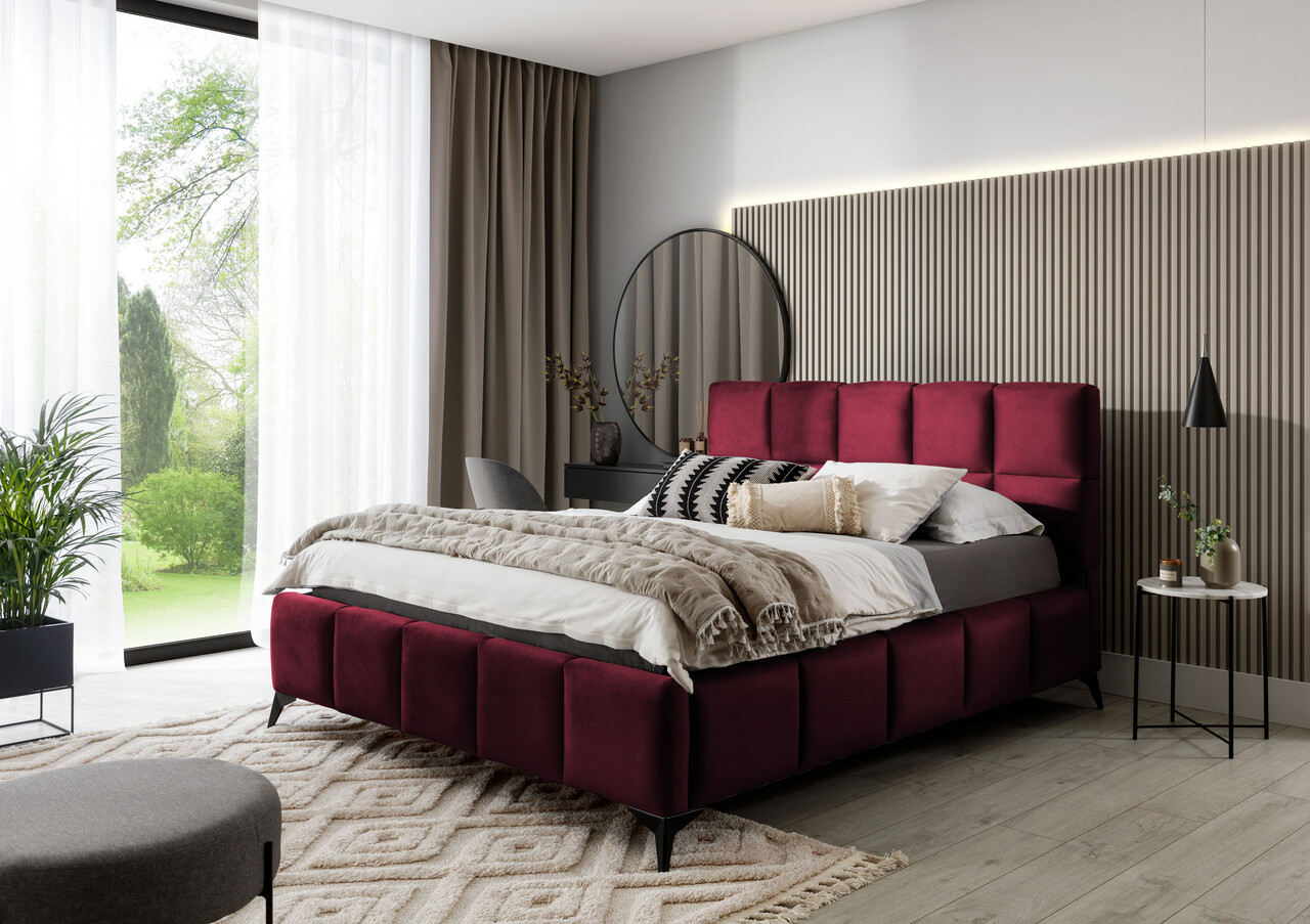 Pat tapitat cu somiera si lada depozitare, 160x200 cm, ELTAP, BE-MIS-25VE, Mist, lemn/poliester, rosu inchis