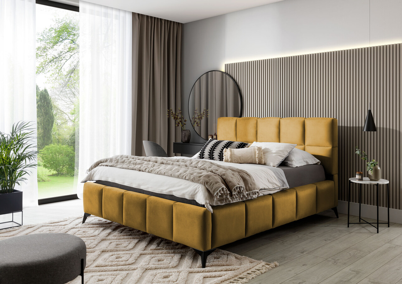 Pat tapitat cu somiera si lada depozitare, 160x200 cm, ELTAP, BE-MIS-45NU, Mist, lemn/poliester, mustar