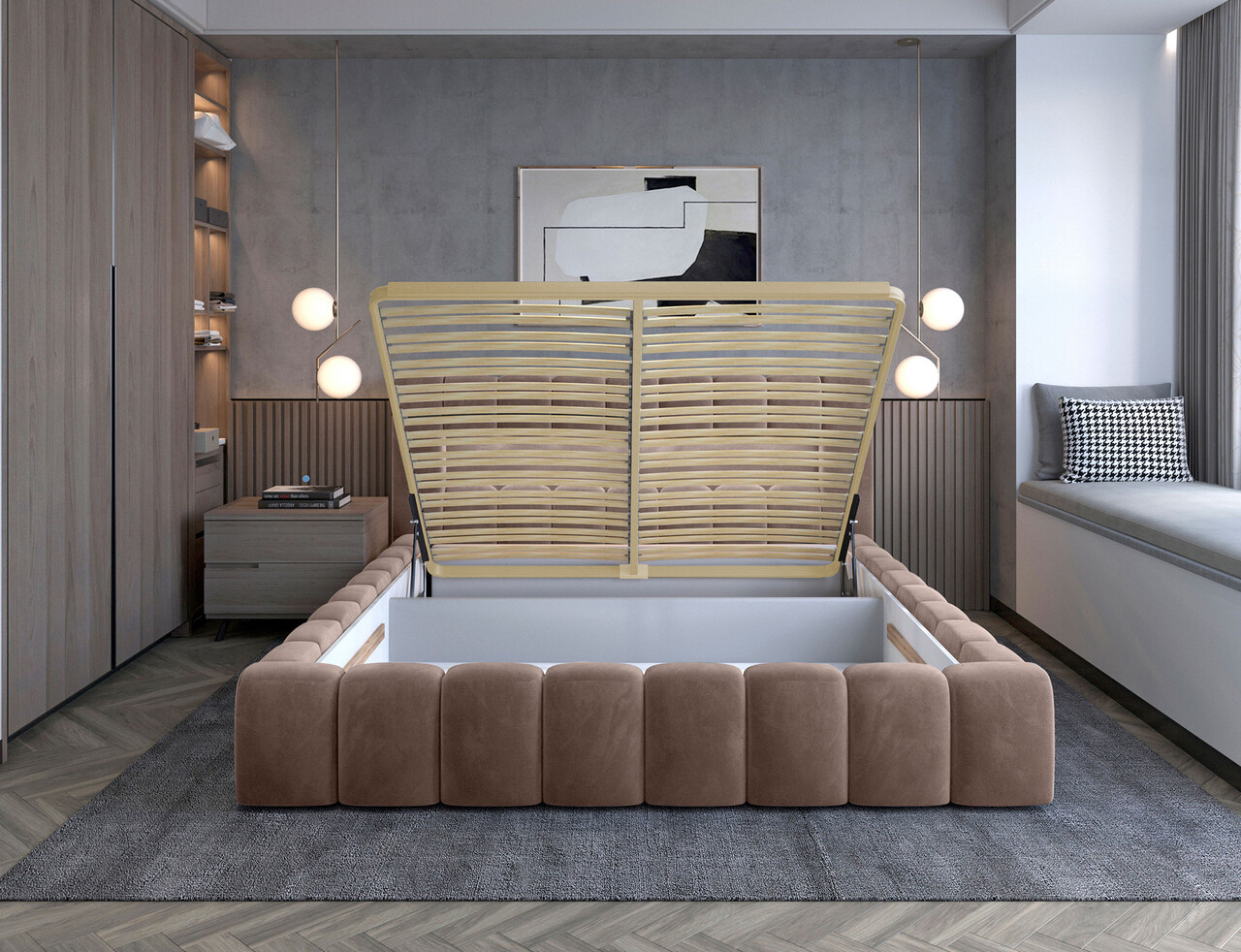 Pat tapitat cu somiera si lada depozitare, 160x200 cm, ELTAP, Lamica, lemn/poliester, maro deschis