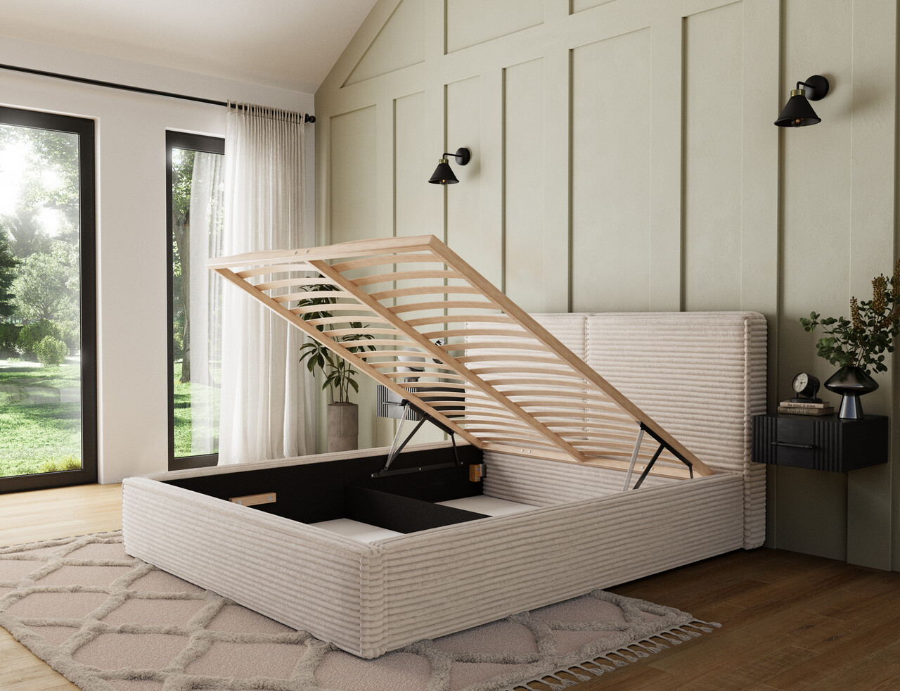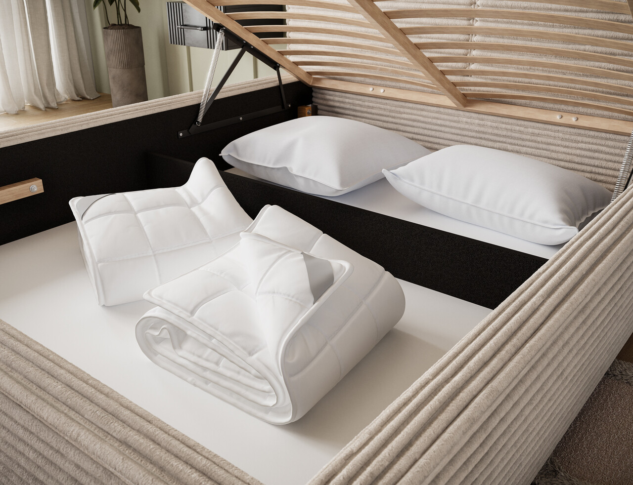 Pat tapitat cu somiera si lada depozitare, 160x200 cm, ELTAP, Pesillo, lemn/poliester, bej deschis