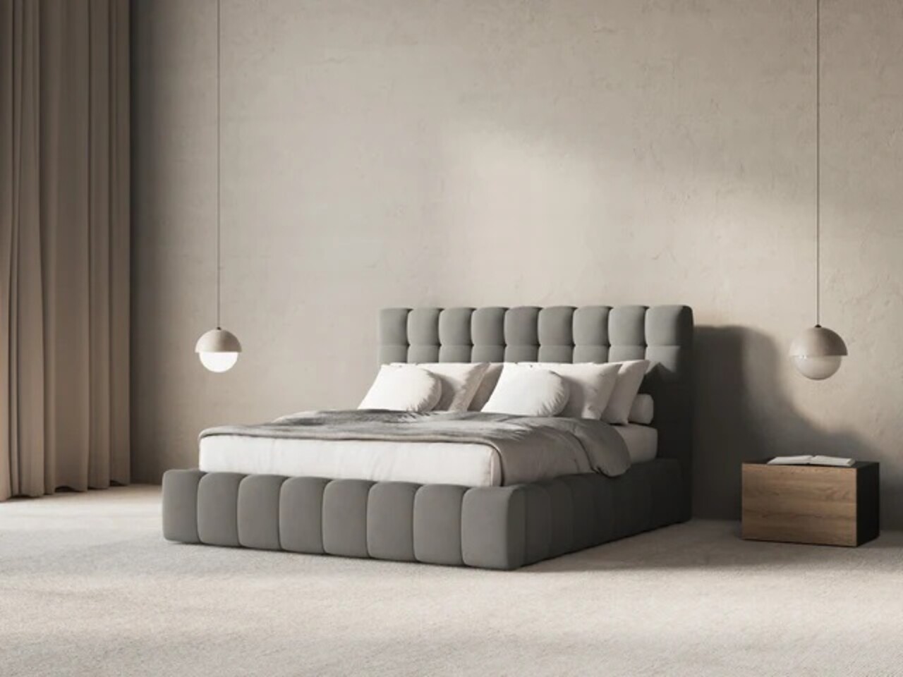 Pat tapitat cu tablie si lada depozitare, Mamaia, Micadoni Home, BL, 160x200 cm, catifea, gri deschis