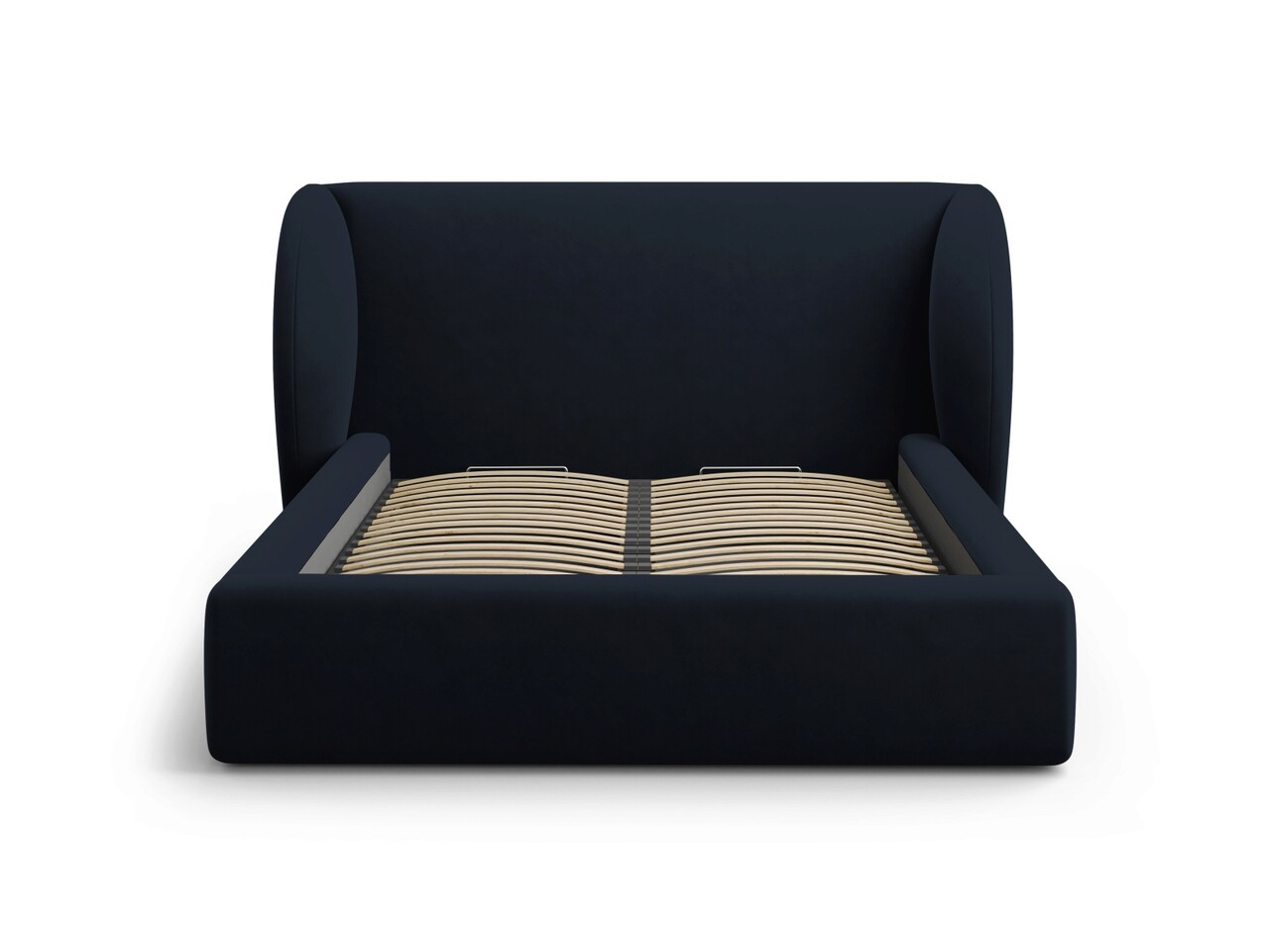 Pat tapitat cu tablie si lada depozitare, Miley, Micadoni Home, BL, 140x200 cm, catifea, albastru inchis