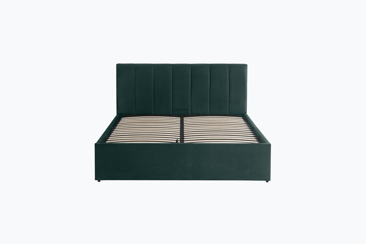 Pat tapitat Frisco, 180x200 cm, somiera rabatabila, spatiu depozitare, verde inchis