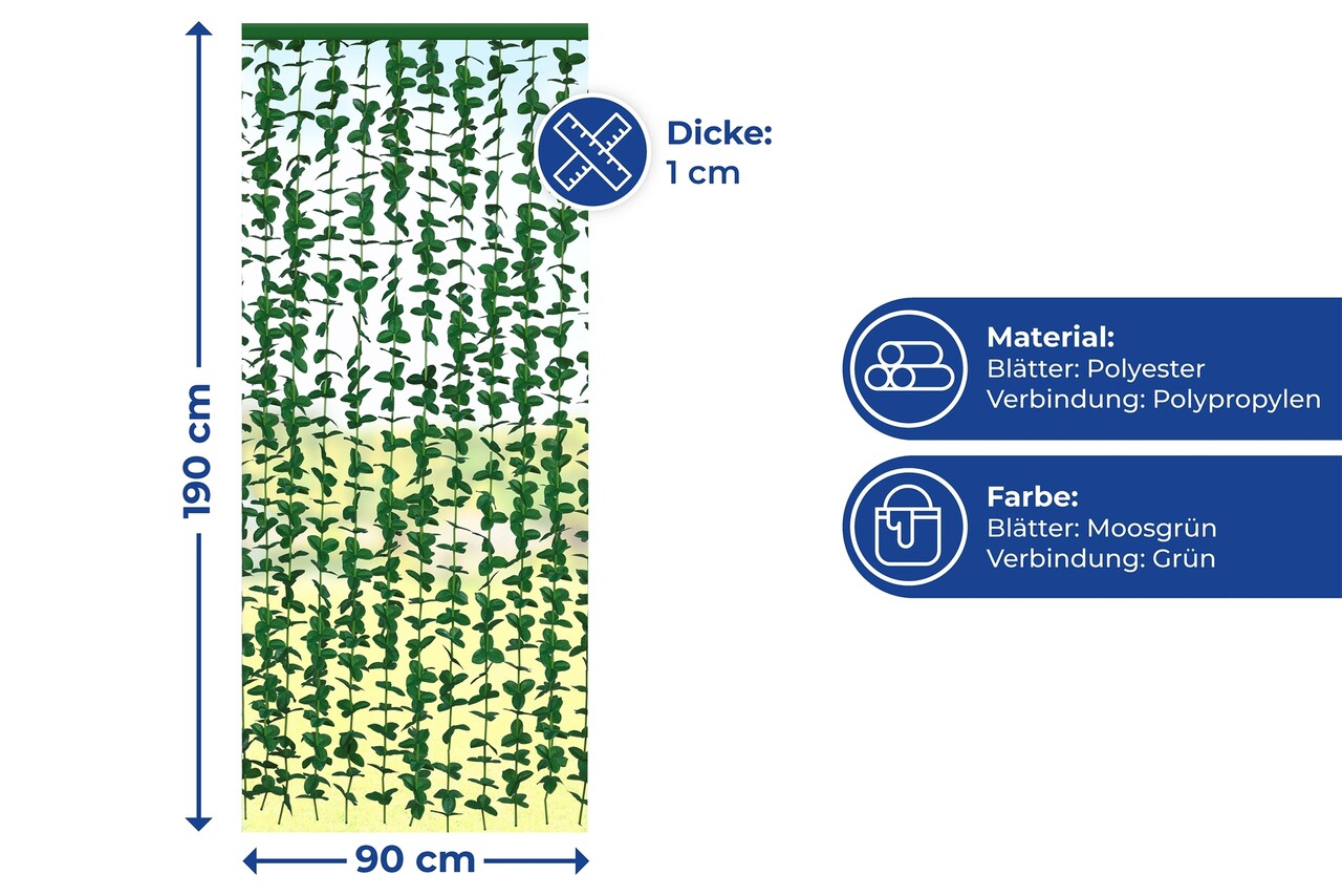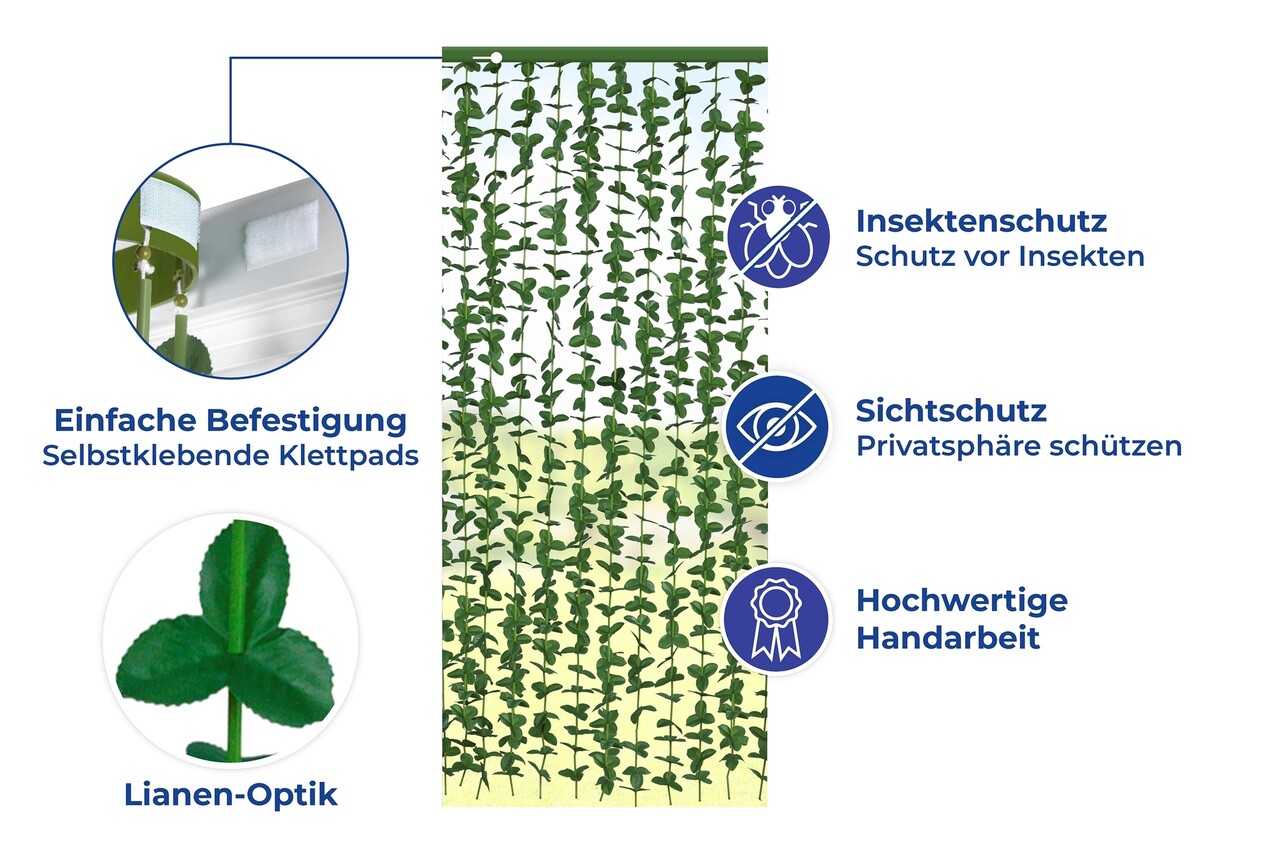 Perdeaua decorativa de usa cu aspect de liana verde este ideala pentru intimitate si poate fi folosita si ca plasa impotriva insectelor.