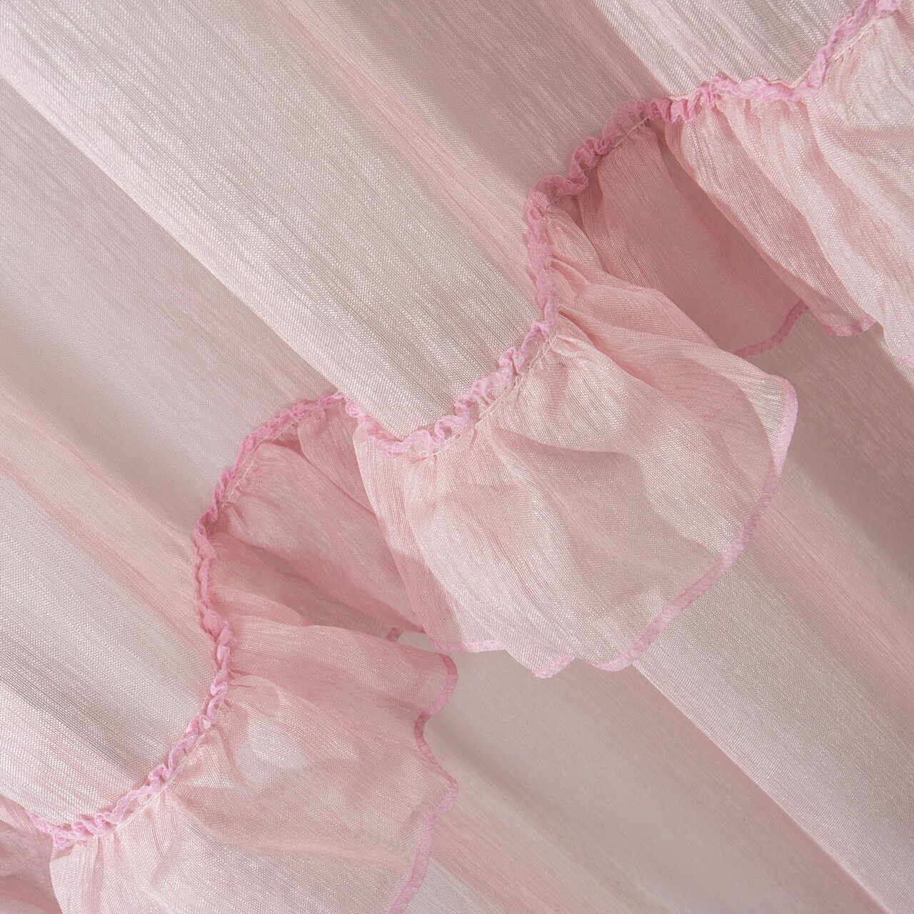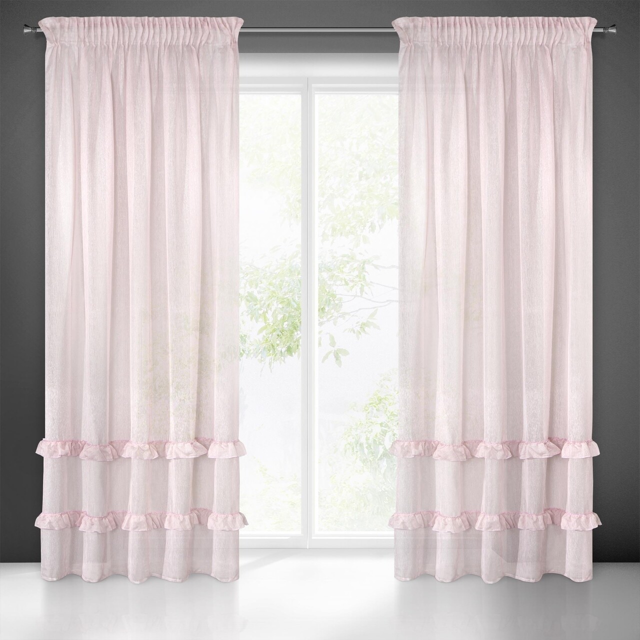Perdea din tesatura usoara si aerisita, cu o structura fina cu aspect de picaturi de ploaie, decorata cu volane in partea inferioara. Volanele fermecatoare sunt perfecte atat pentru interiorul modern, cat si pentru stilurile tipic romantice. Datorita designului si a tesaturii semi-transparente, perdeaua poate fi folosita si ca o draperie delicata.