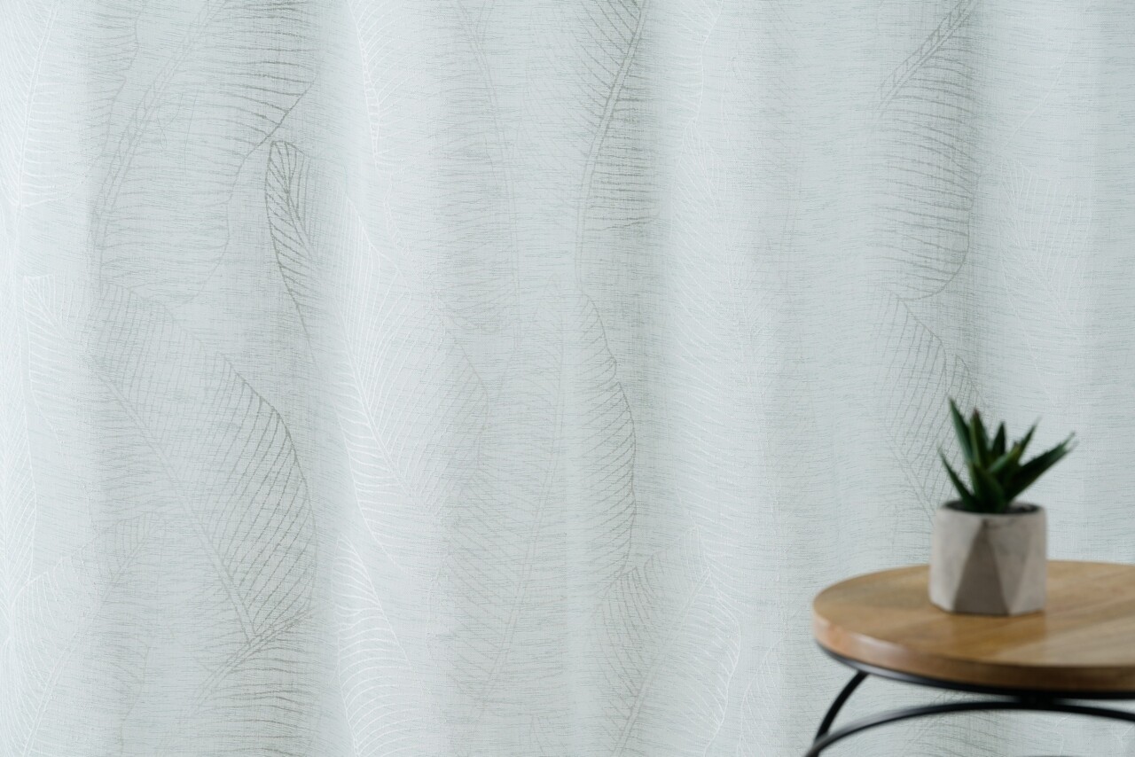 California, perdea cu fundal verzui si patern vegetal, care aduce un aer fresh incaperii si revitalizeaza intreaga amenajare.
