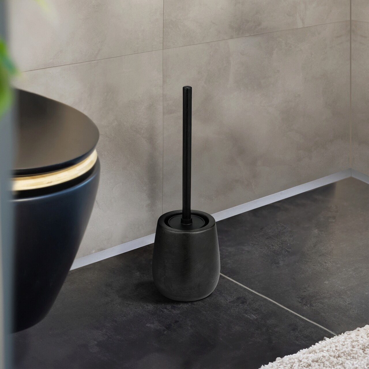 Perie pentru toaleta cu suport Nerno, Wenko, 10.5x39.5 cm, ceramica/inox, negru