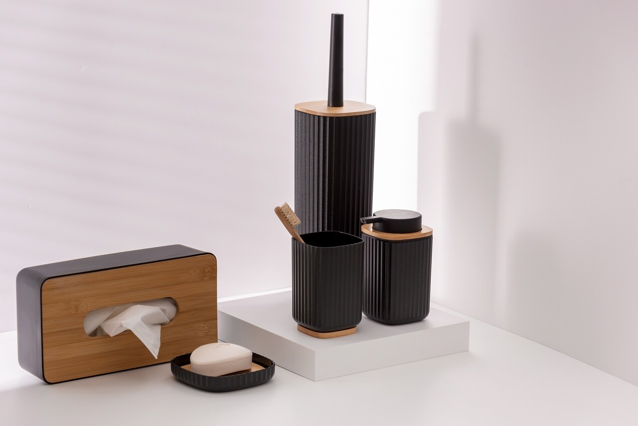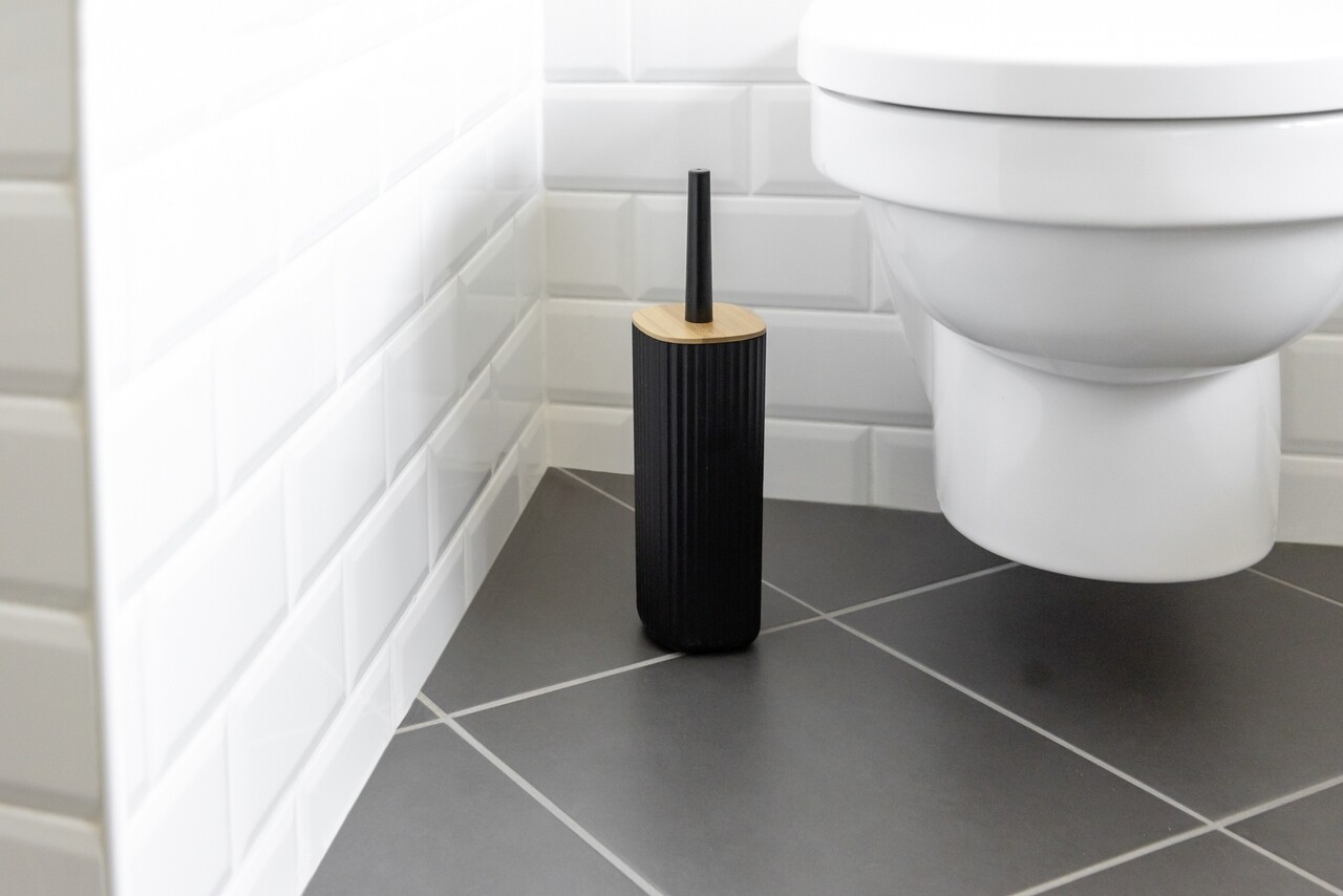 Perie pentru toaleta cu suport, Wenko, Rotello, 10 x 36 x 10 cm, plastic/bambus, negru/maro