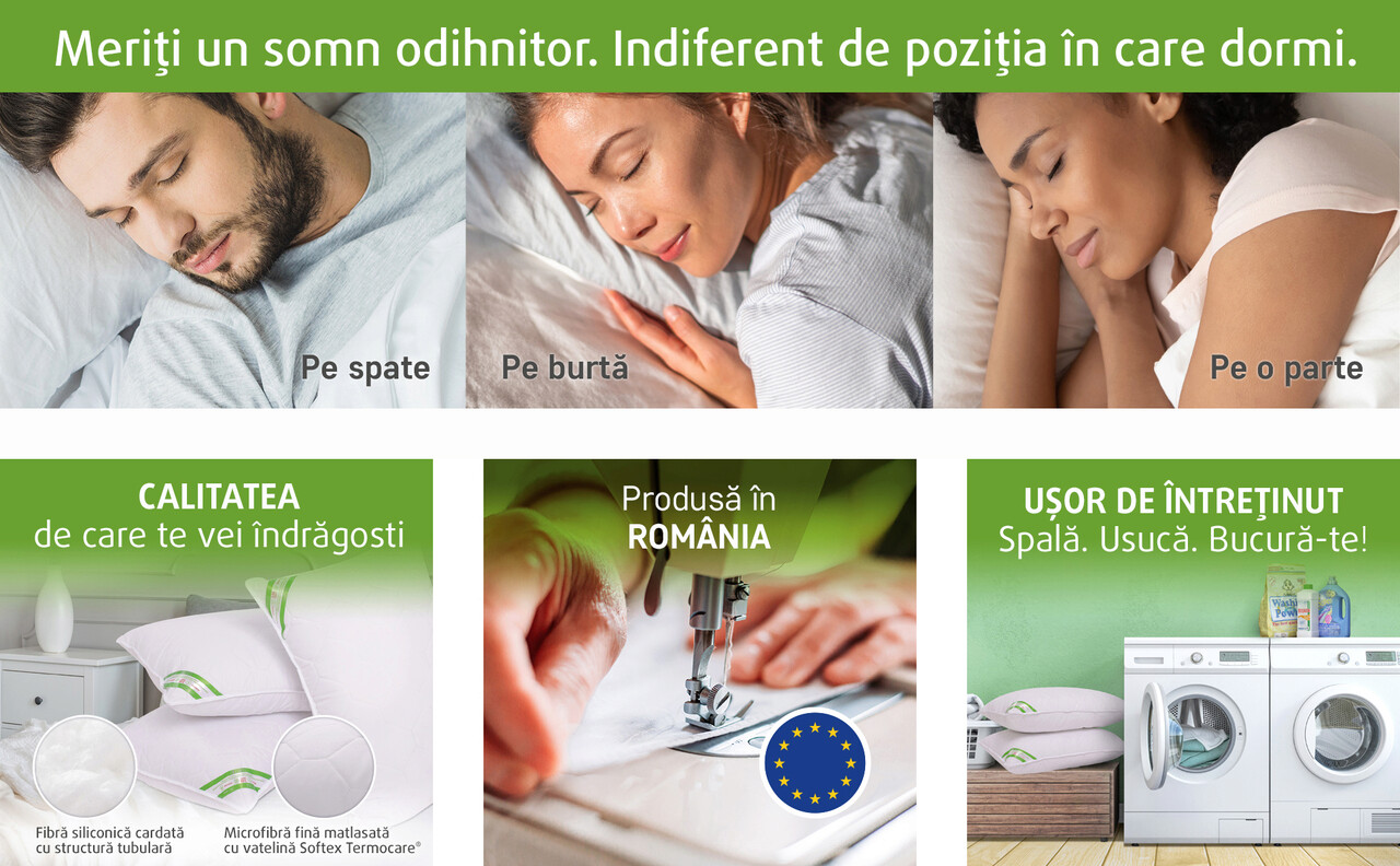 In plus, aceasta perna se caracterizează printr-o elasticitate si o capacitate antiaglomerare a umpluturii foarte bune, pastrandu-si forma si fermitatea pentru o perioada indelungata de timp, chiar si dupa spalari repetate.
