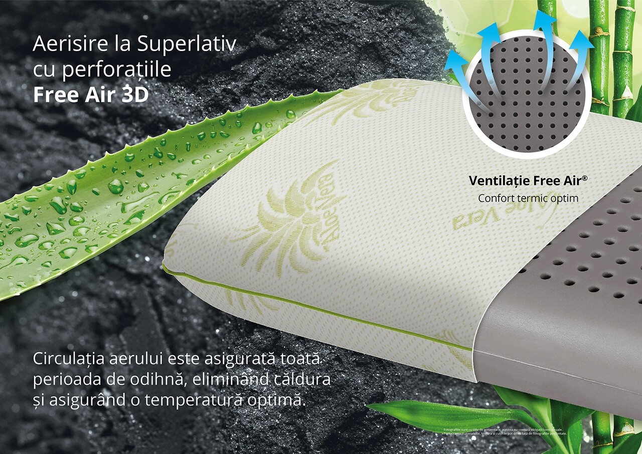 Creata cu materiale de calitate superioara, perna Green Future Aloe Vera Carbune Bambus Memory Free Air ofera o sustinere excelenta a capului si a gatului datorita spumei Green Therm Memory Latex® care se muleaza pe cap, gat si umeri pentru o pozitie naturala a corpului.