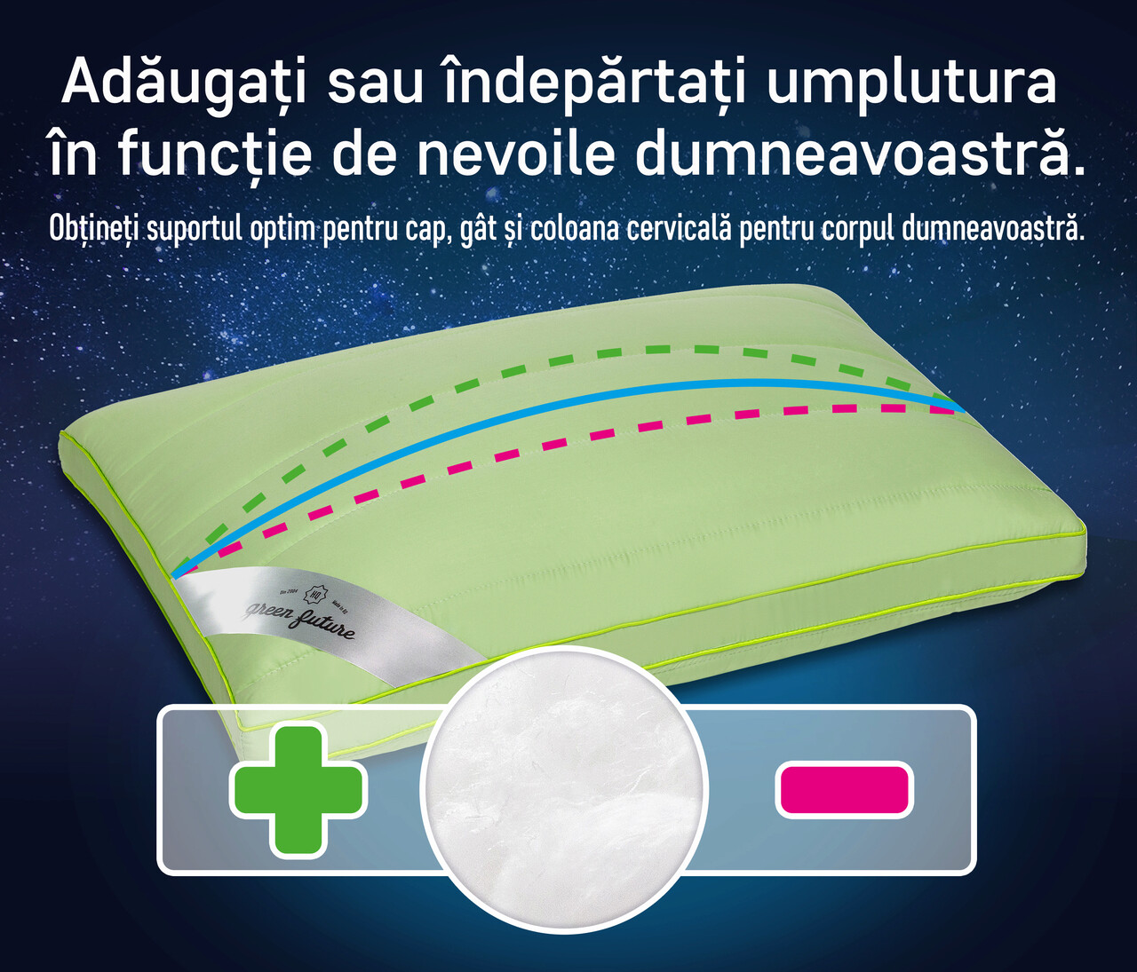 Continutul pernei Nature nu se aglomereaza, avand elasticitate constanta pe toata suprafata, ca tu sa te bucuri de un somn confortabil.