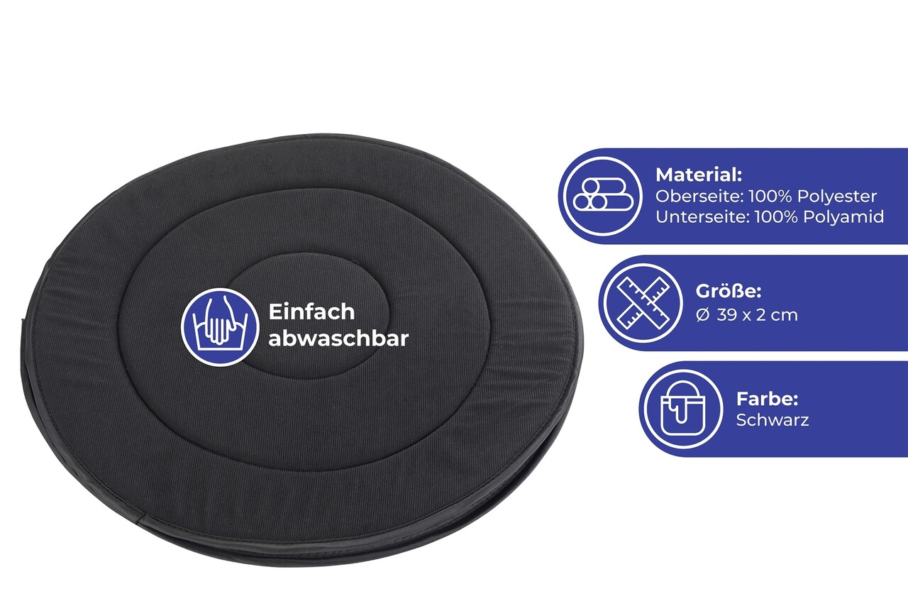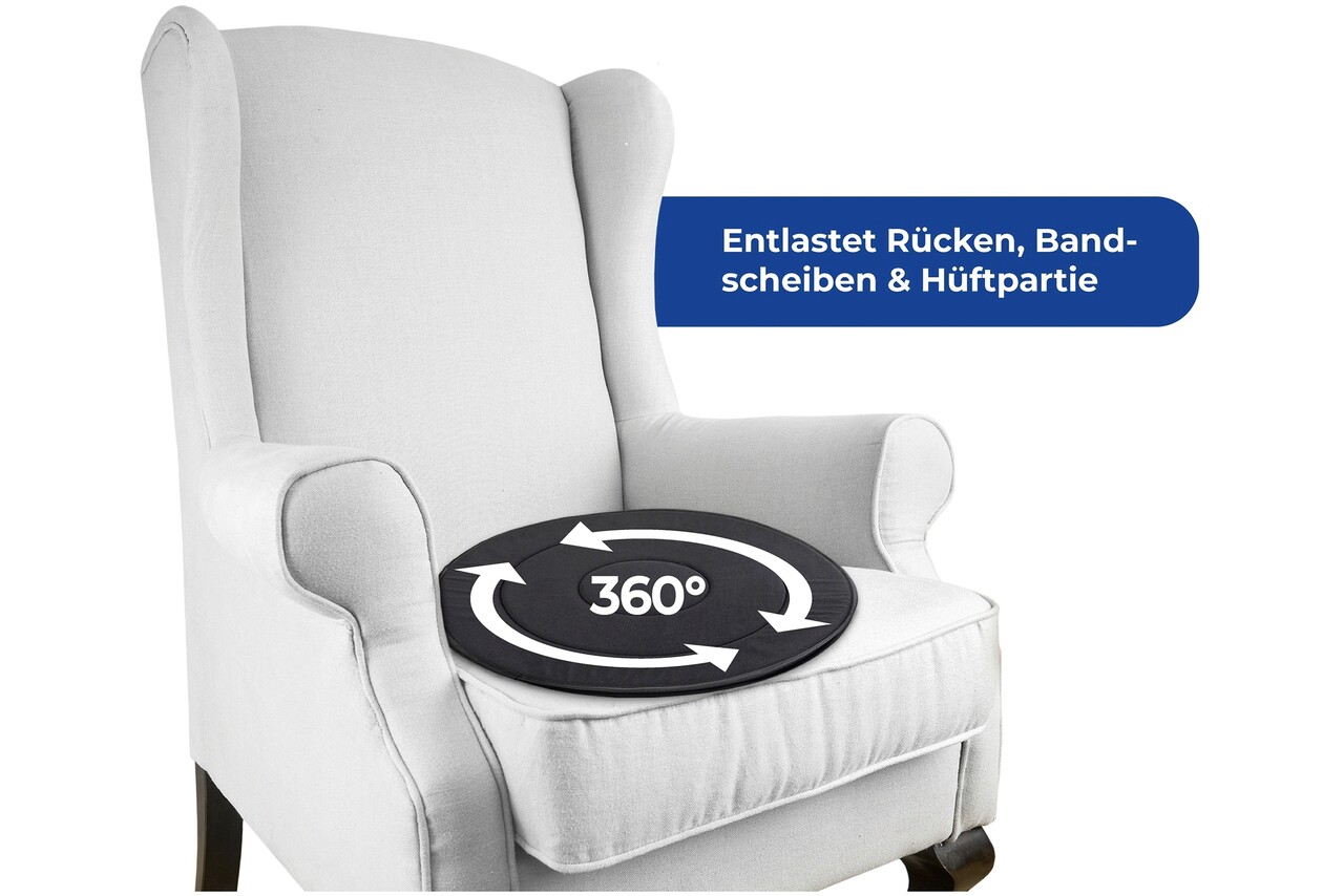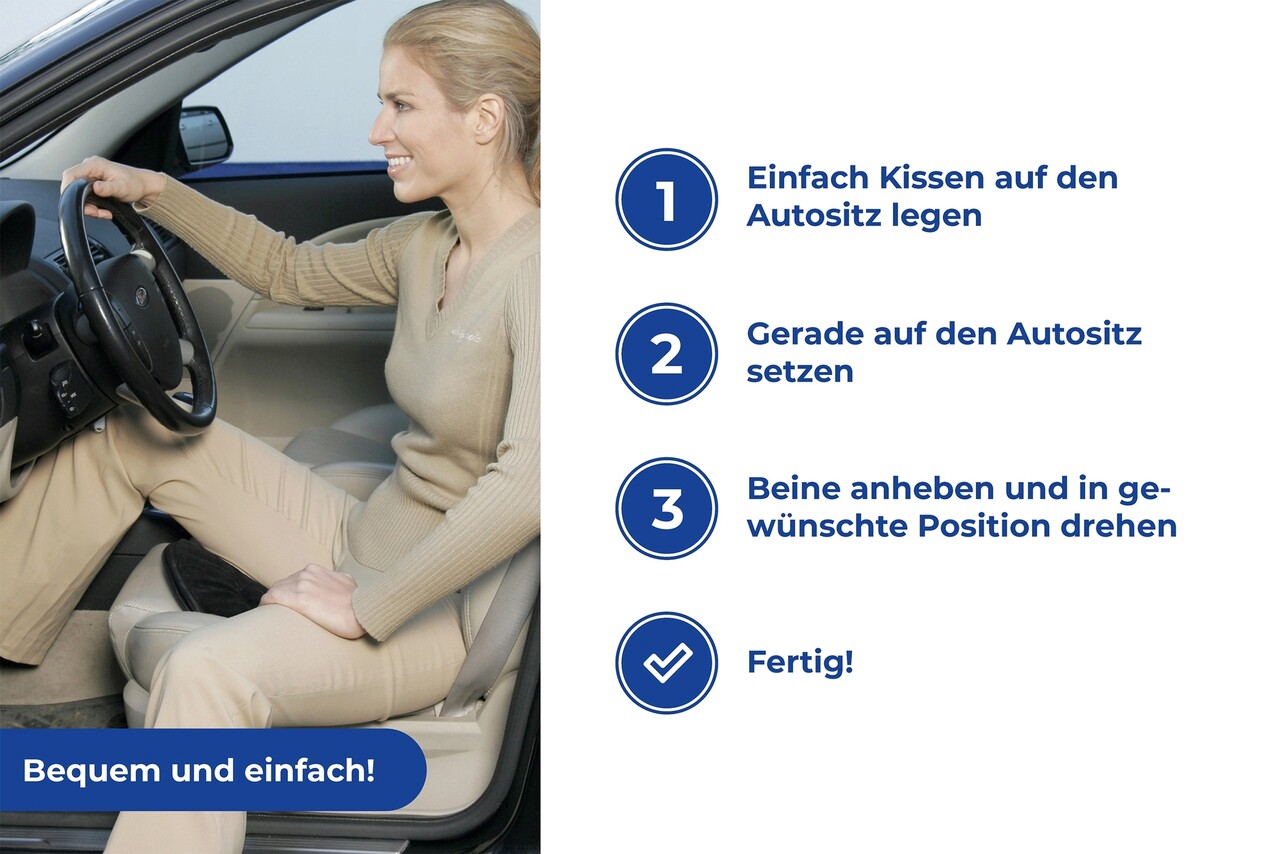 Perna rotativa este potrivita pentru toate scaunele auto standard. Se roteste la 360 de grade si este potrivita pentru persoanele cu dificultati de urcare in masina sau coborare din masina. Este foarte simplu de utilizat. Pur si simplu asezati perna pe scaunul din masina, va asezati pe ea, ridicati picioarele si va intoarceti in masina pe perna rotativa. Pentru a cobori confortabil din masina procedati invers. Ofera confort, mentine si stabilizeaza pozitia sezut indiferent de postura. Potrivita si pentru utilizare in interior. Se curata usor.