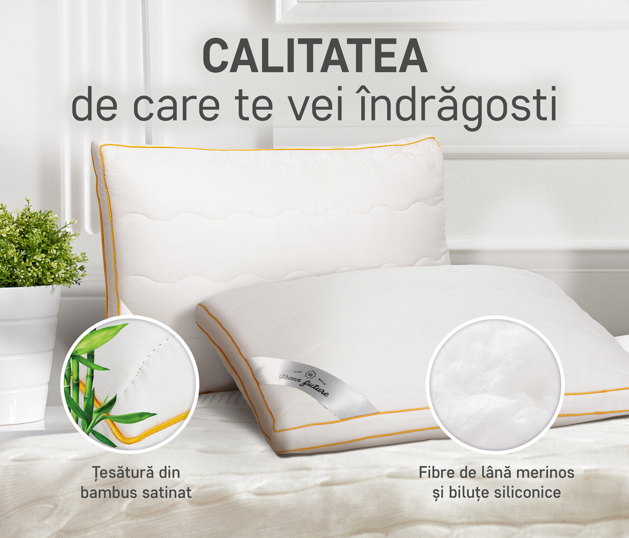 Tesatura din bambus satinat 100% este matlasata cu un strat generos din vata de lana merinos, iar interiorul este umplut cu un amestec de fibre de lana merinos si bilute siliconice.