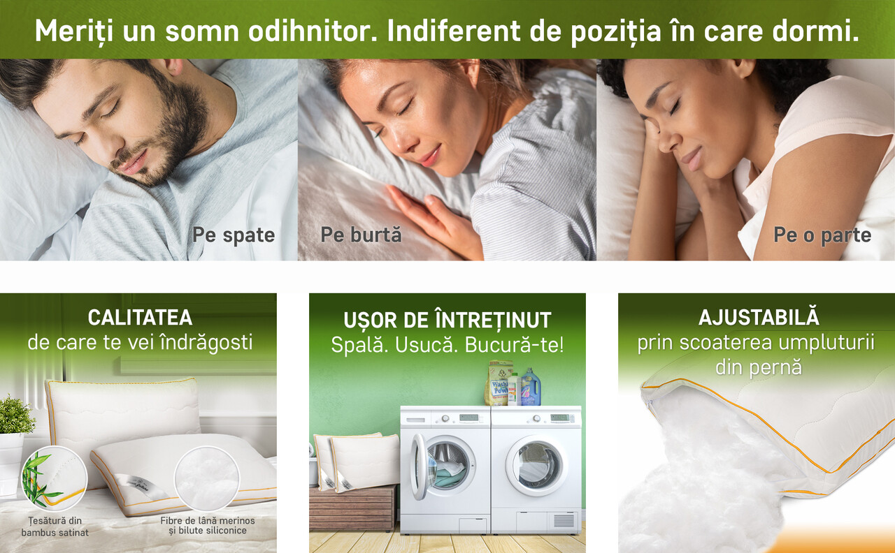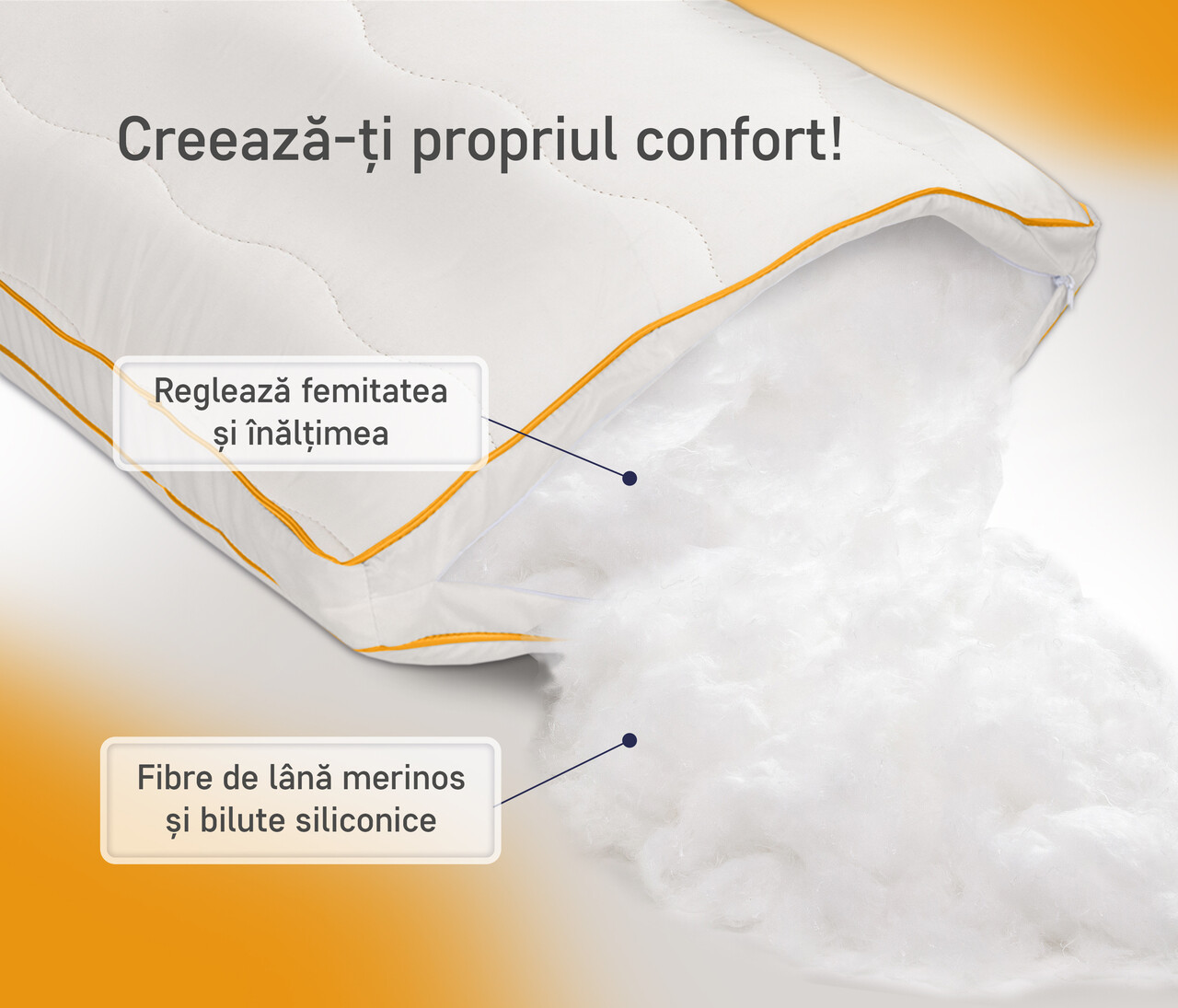 Conținutul noului model de pernă Wool nu se aglomerează, având elasticitate constantă pe toată suprafața, ca tu să te bucuri de un somn confortabil.