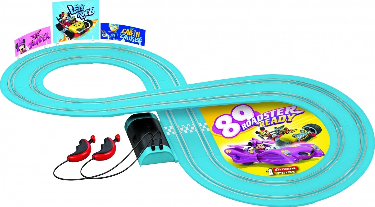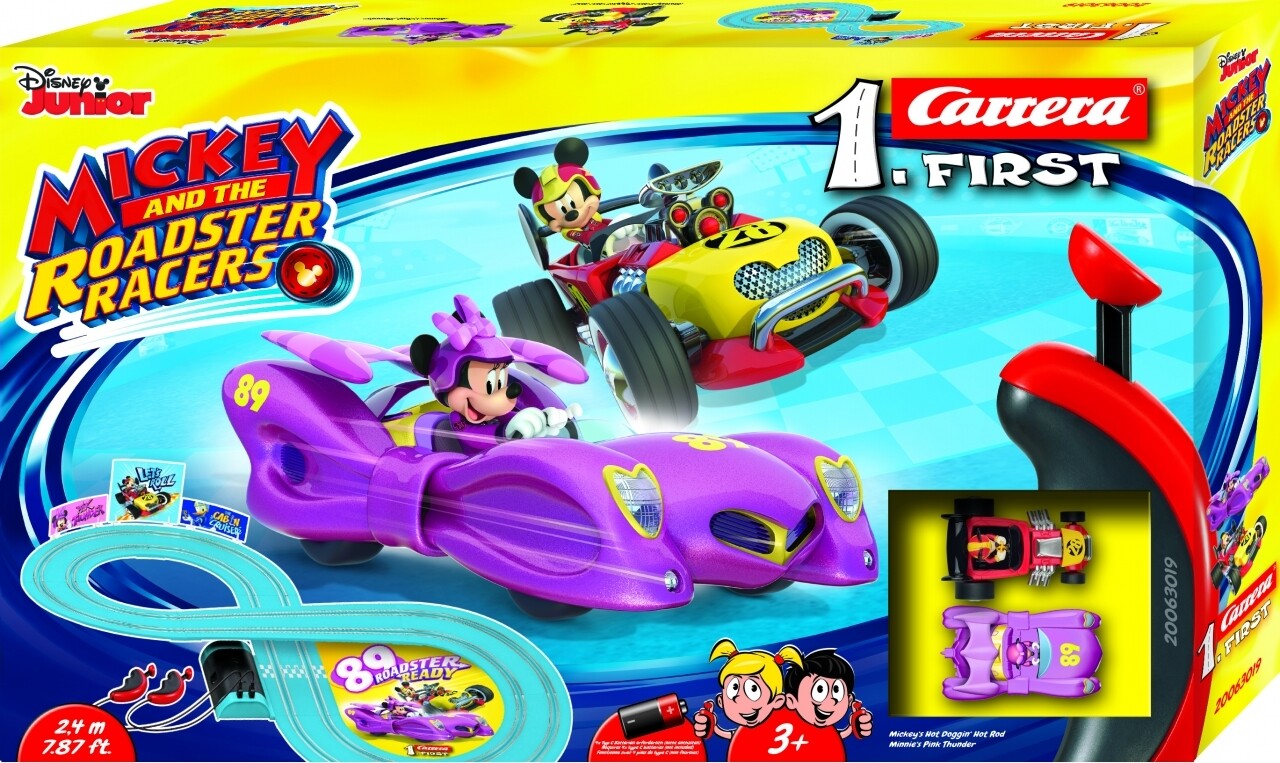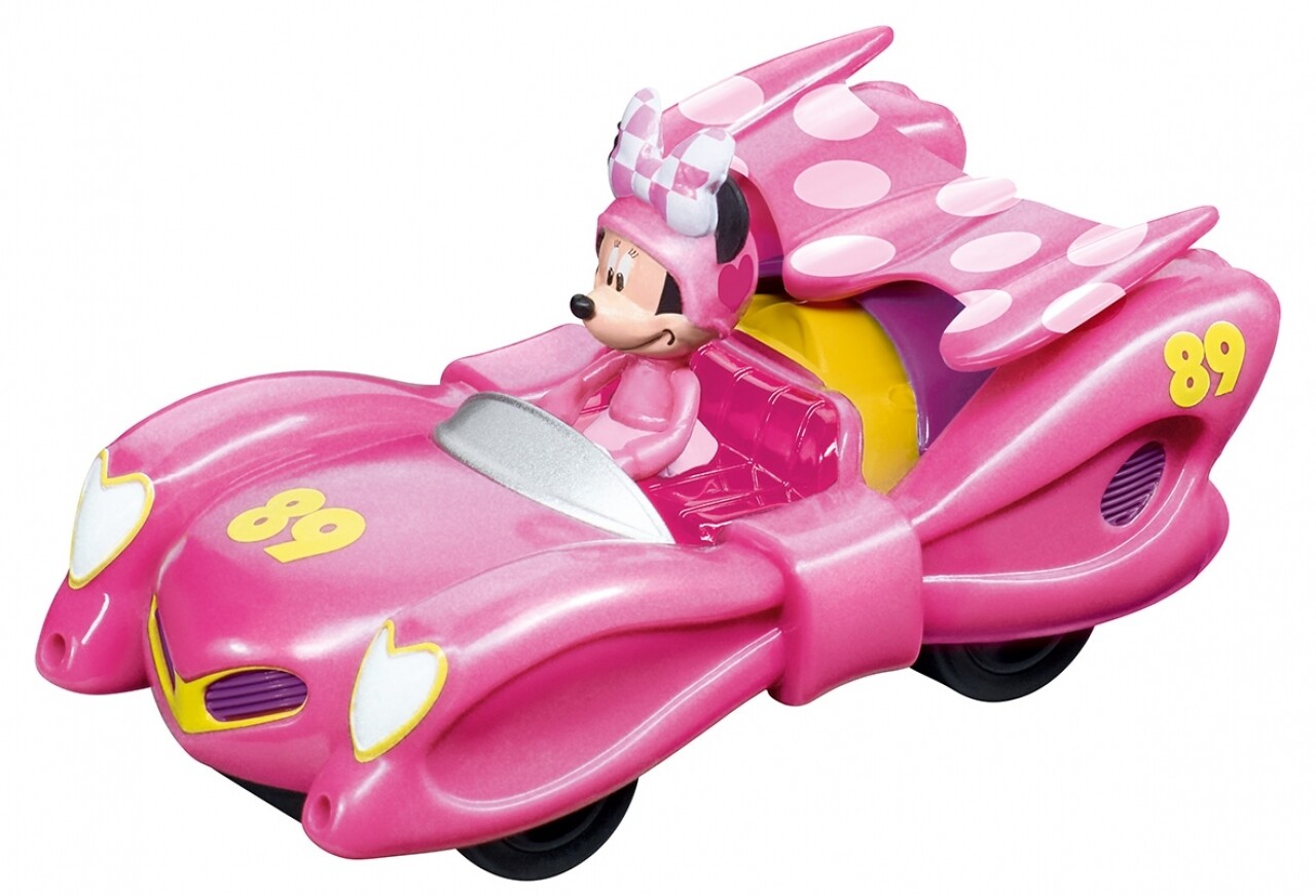 Minnie si pilotii de curse se iau la intrecere pe pista. Circuitul are o dimensiune de 2.4 m, iar masinutele sunt realizata la scara de 1:50. Sunteti gata de cursa? Oare cine va termina primul cursa?