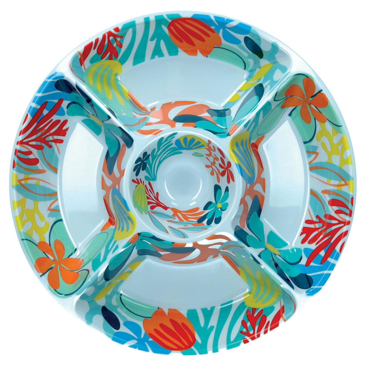 Creeaza o atmosfera de vacanta chiar la tine acasa cu platoul din colectia Tahiti! Decorata cu imprimeuri tropicale si linii moderne, aceasta piesa din melamina durabila aduce un strop de energie si prospetime oricarei mese. Practic, sigur, fara BPA si usor de curatat, este perfect pentru servirea gustarilor, aperitivelor sau deserturilor, atat in interior, cat si afara.