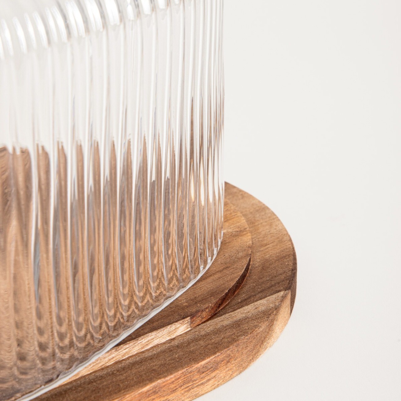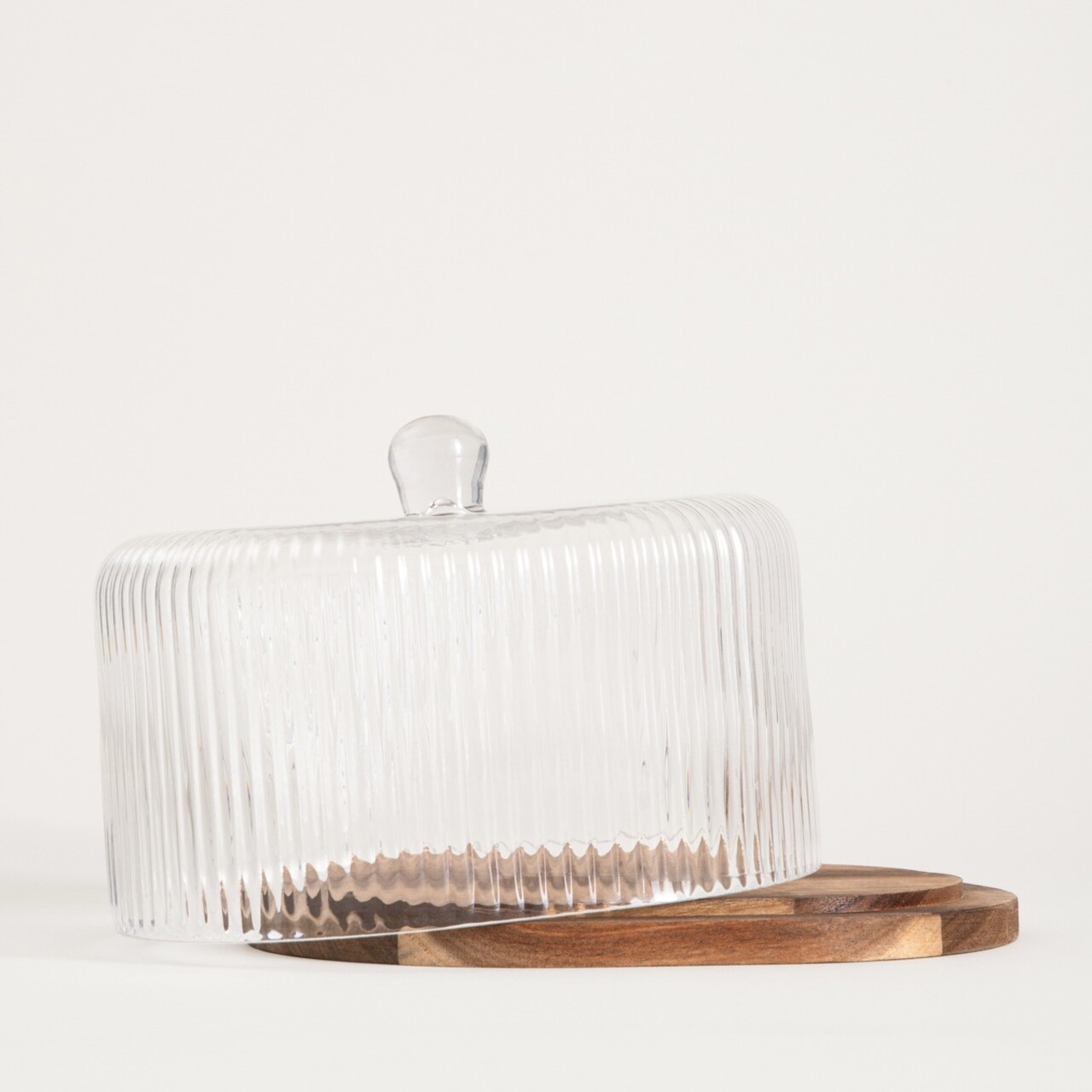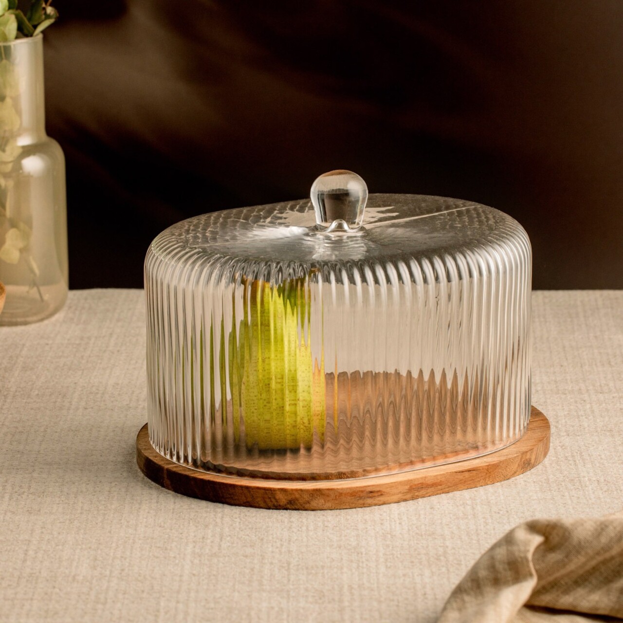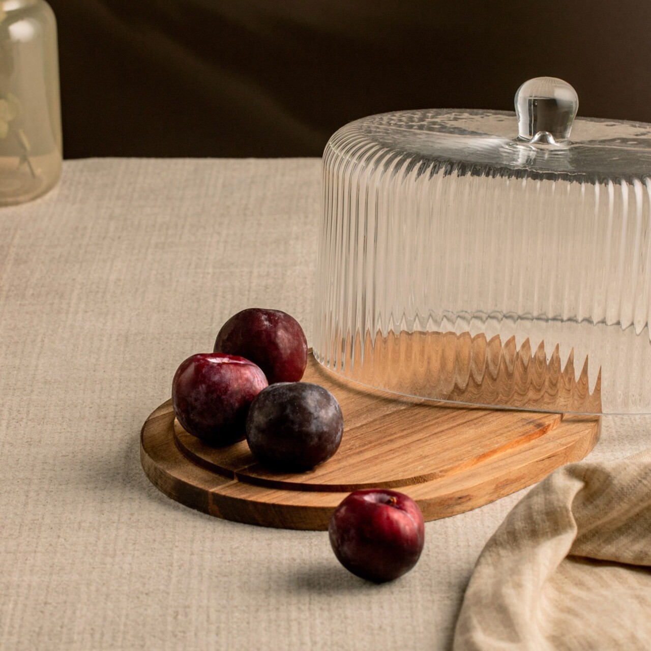 Platoul este fabricat din sticla si lemn de salcam, destinat contactului cu alimentele. Capacul din sticla poate fi spalat in masina de spalat vase, in timp ce baza din lemn trebuie spalata manual. Nu este potrivit pentru utilizarea in cuptorul cu microunde. Temperatura maxima de utilizare in conditii de siguranta este de 60° C.