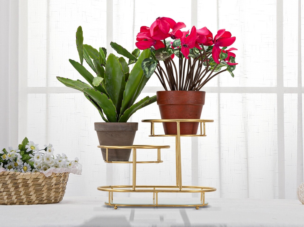 Tava cu trei niveluri din metal aurit cu blat din sticla oglindita. Structura particulara, dar esentiala, creeaza un obiect util si de design care combina caracterul practic si stilul.