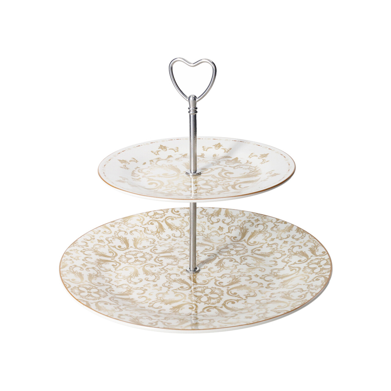 Platou etajat cu 2 nivele - Practic si elegant, cu maner metalic in forma de inimioara, perfect pentru servirea delicateselor. Modelul auriu adauga un plus de rafinament in orice context, fie festiv, fie cotidian.