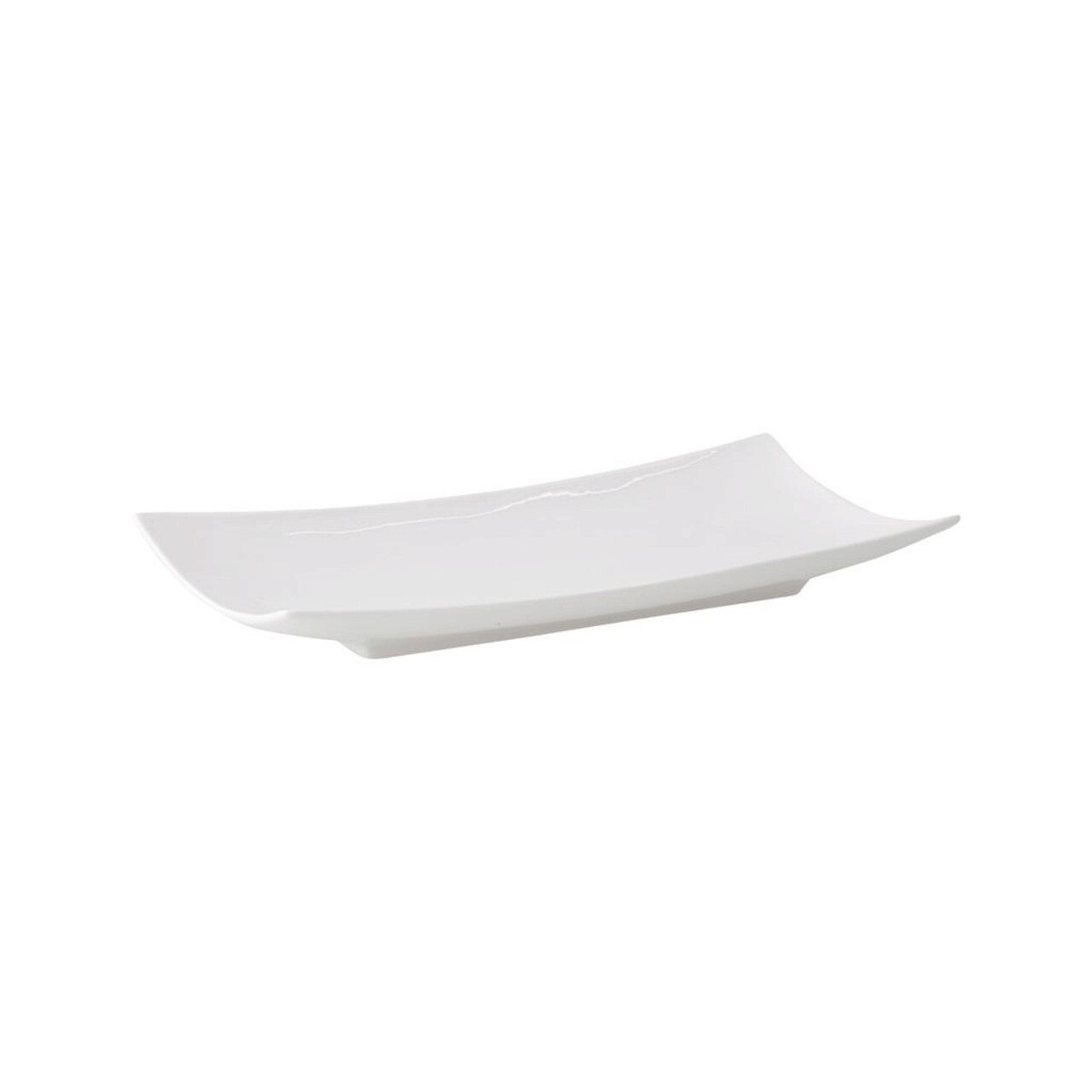 Platou pentru servire, din portelan alb de inalta calitate. Prezinta o forma interesanta, moderna, insa culoarea ii pastreaza eleganta si simplitatea. Se poate spala cu usurinta in masina de spalat vase si poate fi folosit in cuptorul cu microunde.