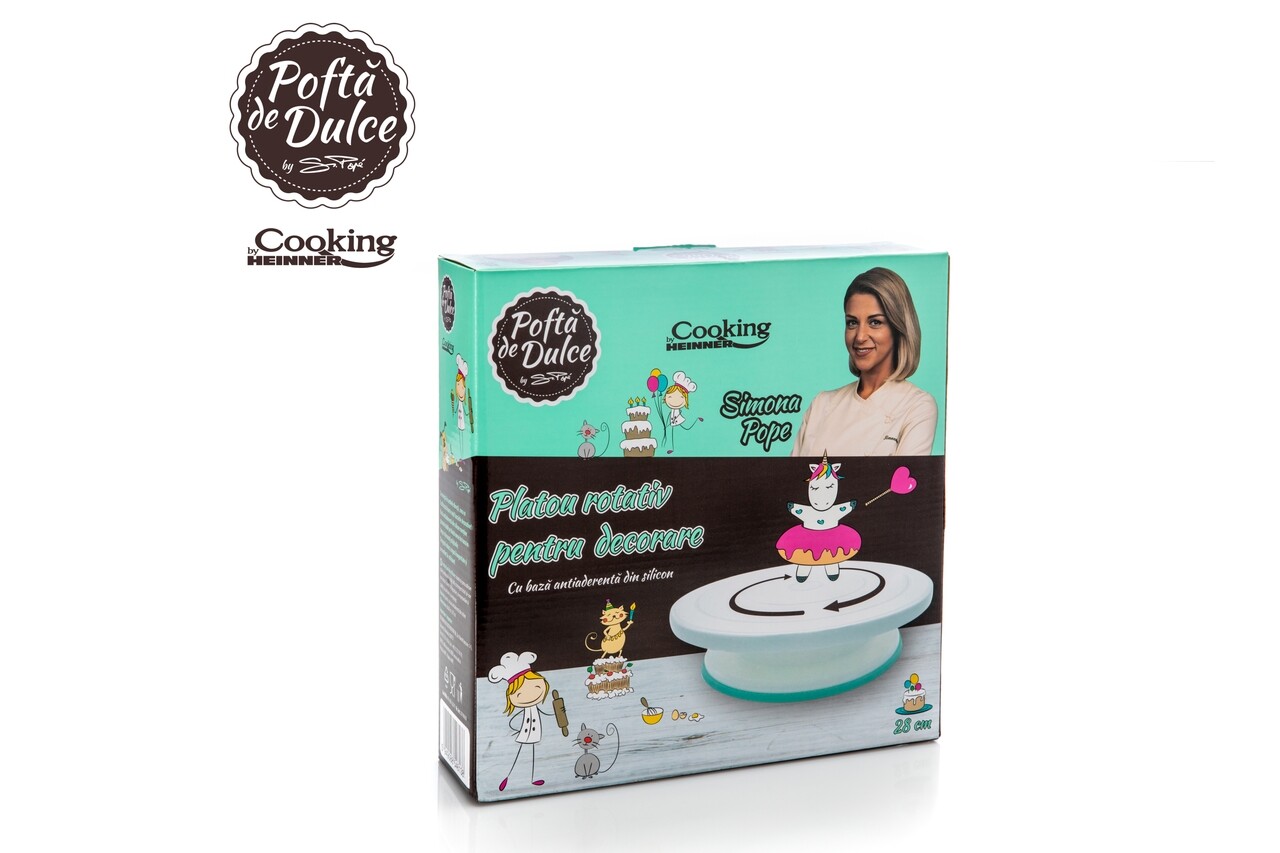Platoul rotativ este ajutorul de nadejde pentru cofetari atunci cand vine vorba de ornarea torturilor sau prajiturilor. Acesta se roteste in ambele directii, are o baza antiaderenta din silicon ce mentine platoul stabil pe blatul mesei de lucru in timp ce decorati prajiturile.