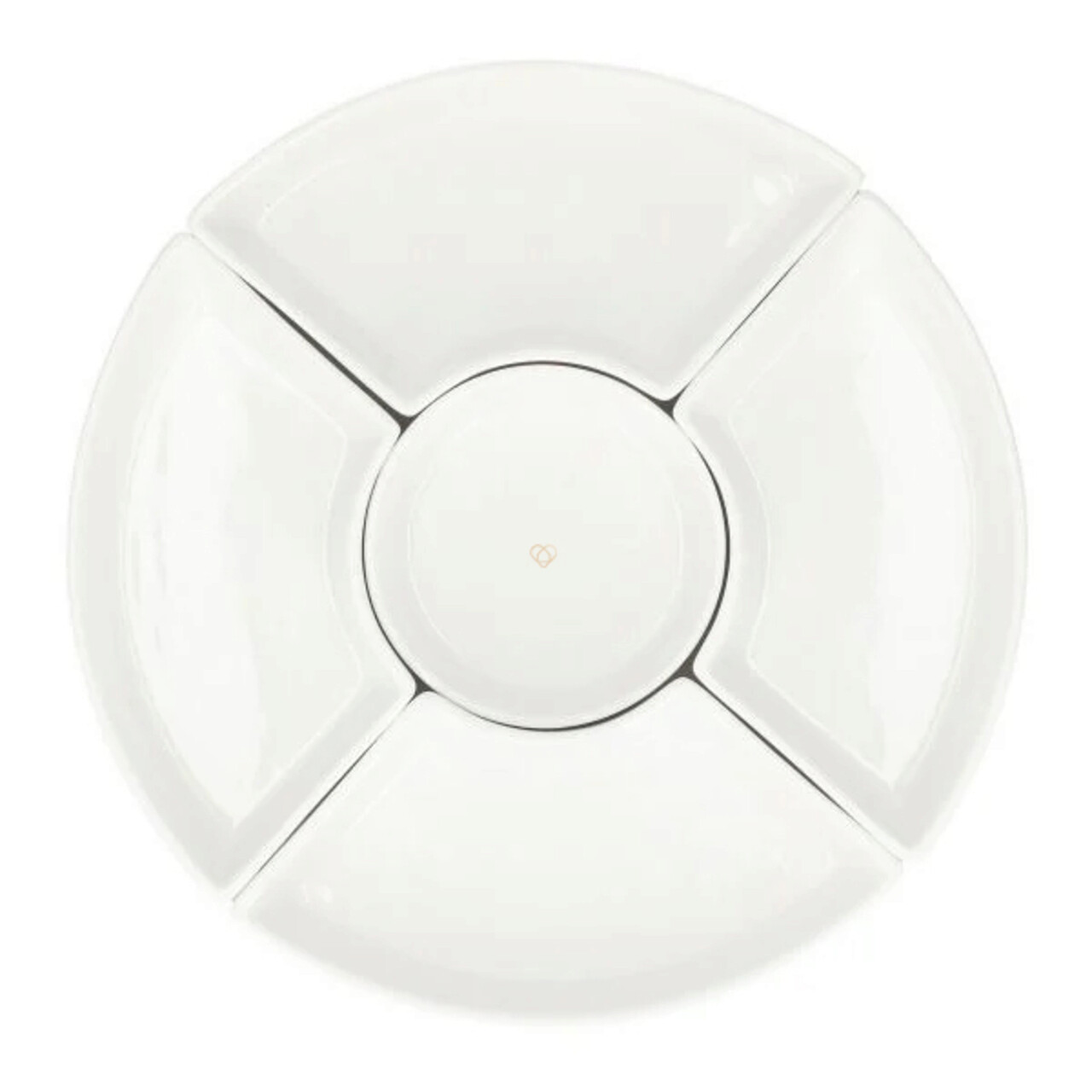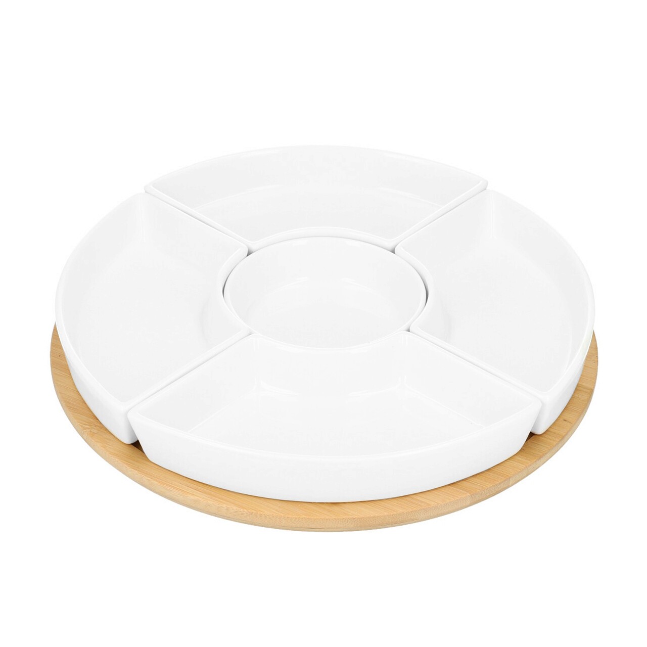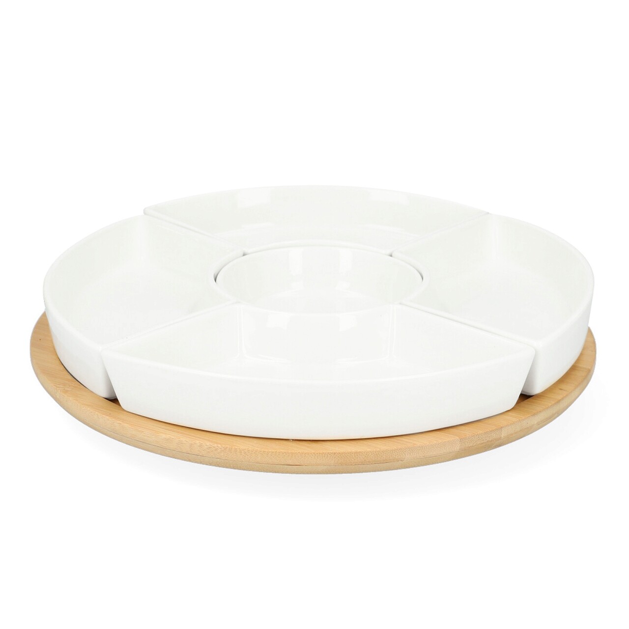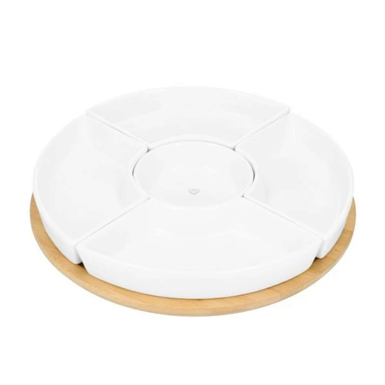 Platoul FINCAN este format din cinci parti asezate in cerc – fiecare parte fiind un bol separat pentru gustari sau sos. Baza din bambus este rotativa, ceea ce face mai usoara impartirea gustarilor la masa. Platoul are un design in alb clasic si lemn natural, astfel incat se integreaza frumos atat cu vesela eleganta, cat si cu decorul traditional de masa. Diametrul produsului este de 30 cm.