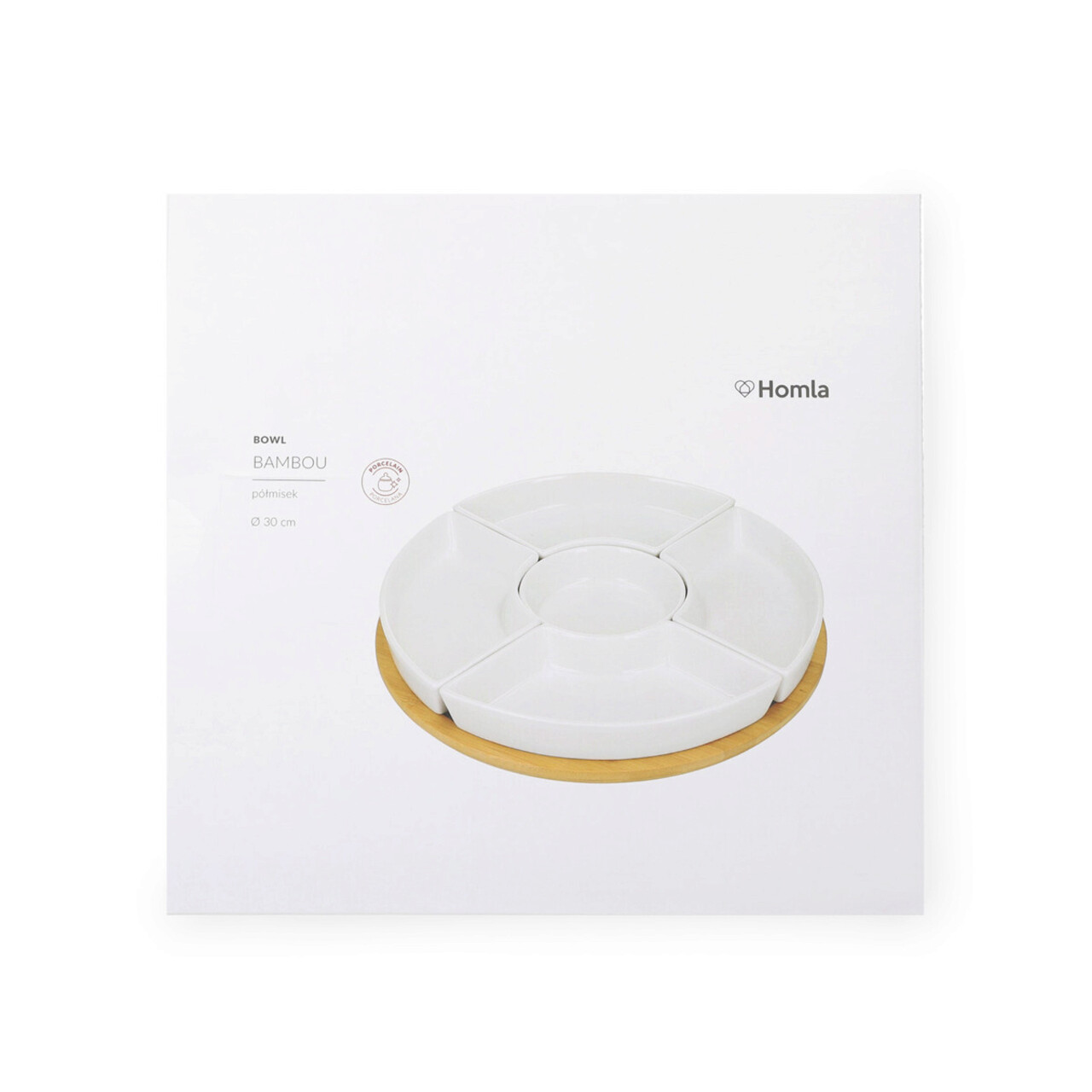 Platou servire cu tava rotativa Fincan, Homla, 30 cm, portelan/bambus, alb/natur