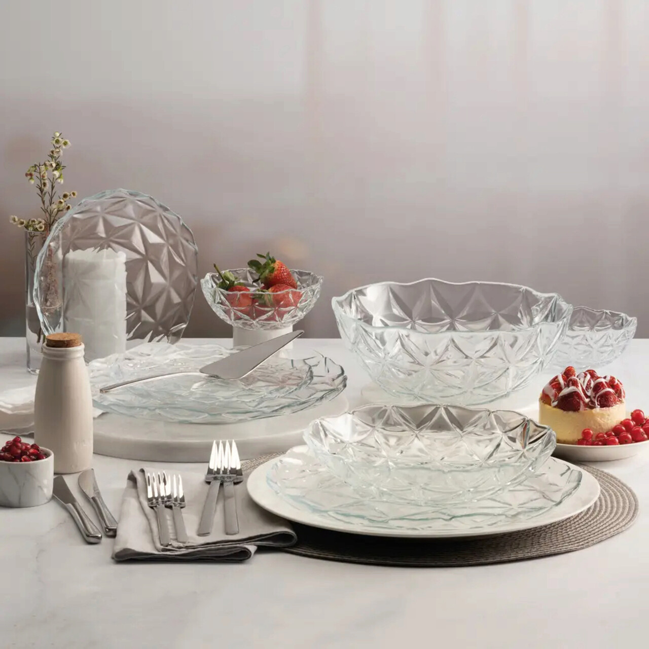 Platoul oval din colectia Estrella are dimensiunea de 33X25 cm este fabricat din sticla extrem de rezistenta la deteriorare. Impresioneaza prin designul sau neobisnuit, caracterizat printr-un model geometric si o margine neregulata.