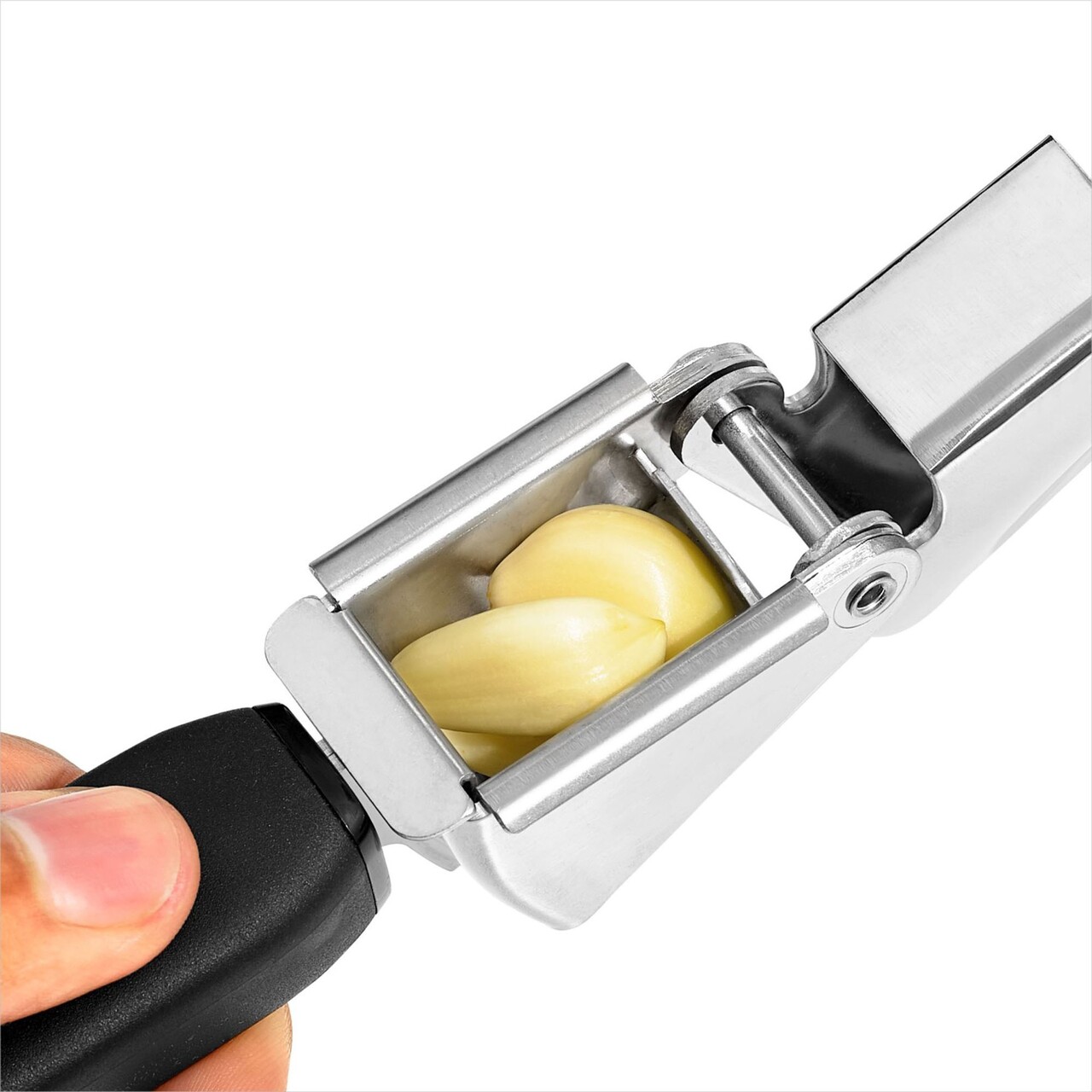 Doar strangeti cu putere bratele presei, Iar apoi curatati-o cu usurinta. Veti zdrobi usturoiul in doar cateva secunde si veti evita toata bataia de cap si mirosul nedorit ce apar atunci cand taiati usturoiul pe tocator.
