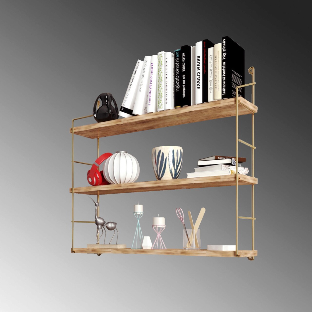 Raft de perete, Cerritos, 3'lü Duvar Rafı, Bibliotecă, 60x16x62 cm, Lemn masiv, Auriu/Maro