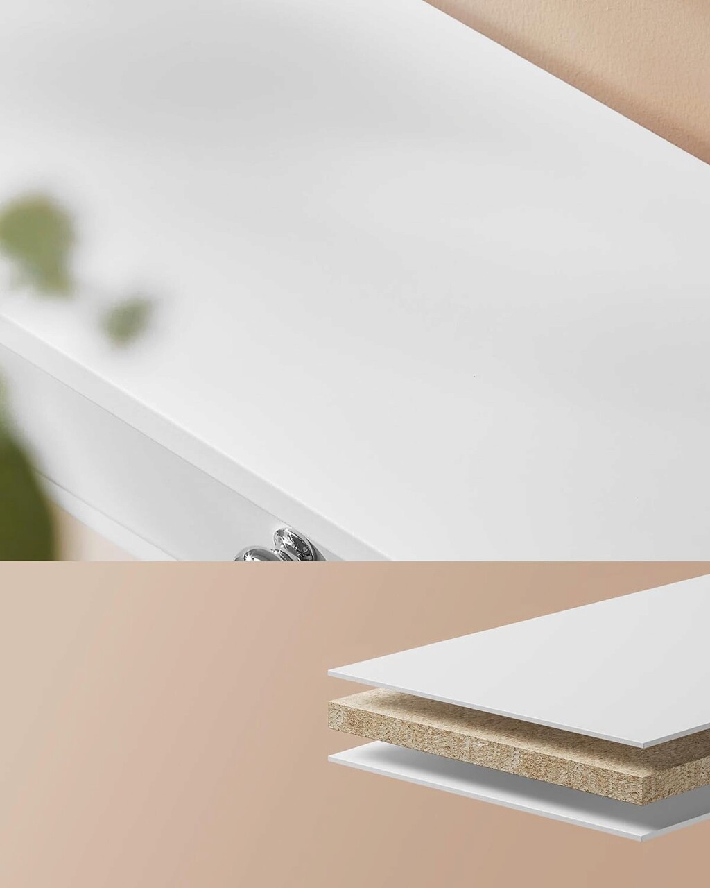 Suport sigur si fiabil Echipate cu opritori, sertarele nu pot fi scoase complet, asigurandu-va siguranta; confectionat din MDF calitate, acest raft de perete va rezista multi ani de acum incolo.