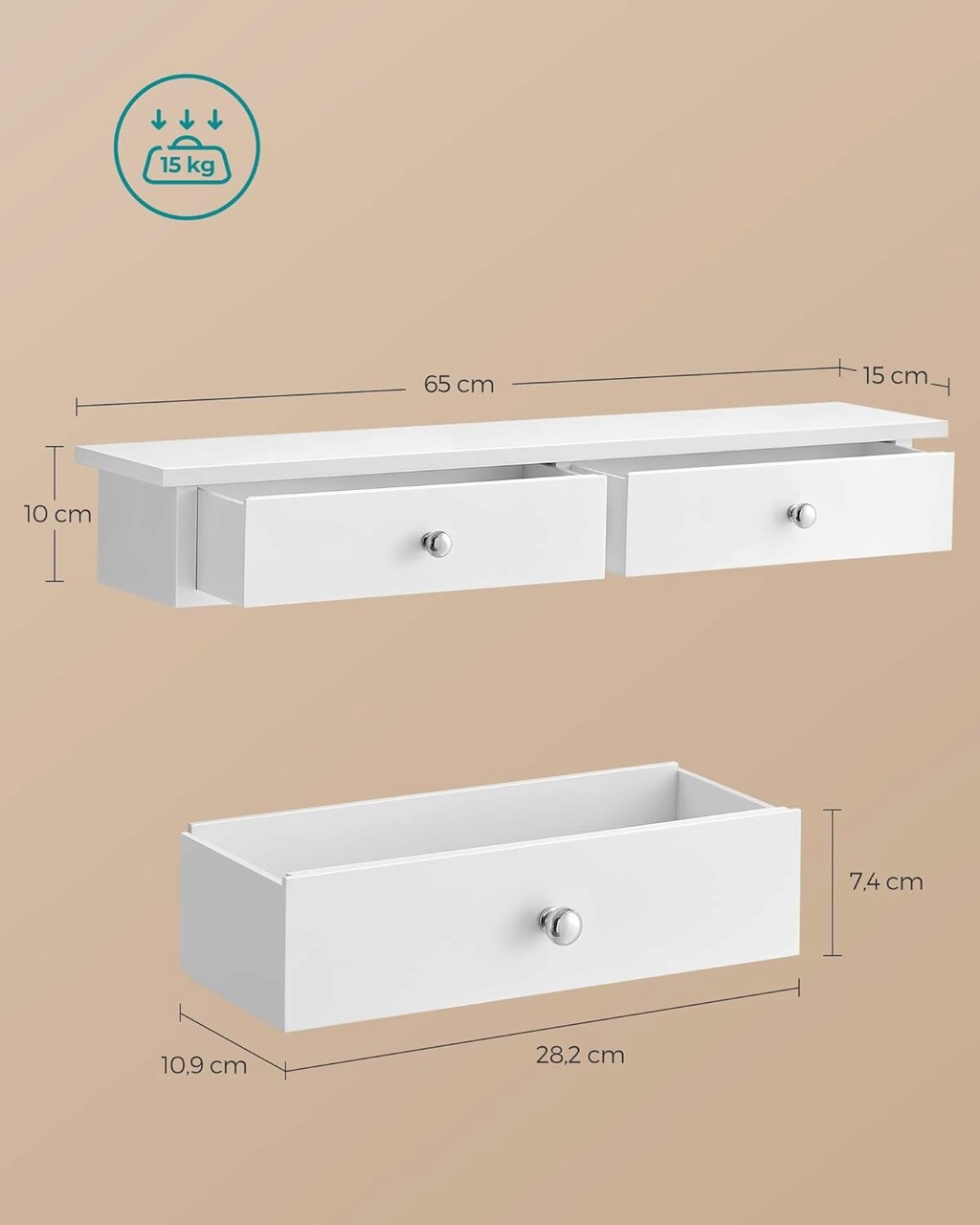 Raft de perete cu 2 sertare, Songmics, 65x15x10 cm, MDF, alb