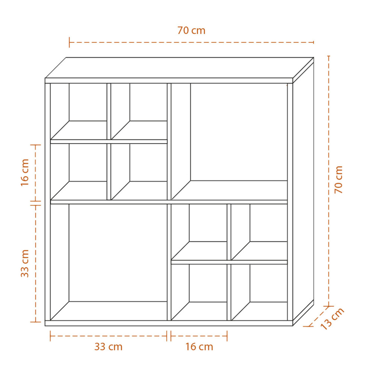 Acest raft de perete va pune in valoare bibelourile si colectiile, adaugand in acelasi timp o nota decorativa peretelui. Poate fi plasat in sufragerie, dormitor sau chiar la intrare pentru a crea o ambianta moderna. Designul sau alb-negru se imbina perfect cu orice decor. Cele 10 nise de diferite dimensiuni confera raftului un aspect eclectic. Puteti aranja obiecte precum lumanari, fotografii, vaze sau CD-uri pentru a se potrivi stilului dumneavoastra personal.