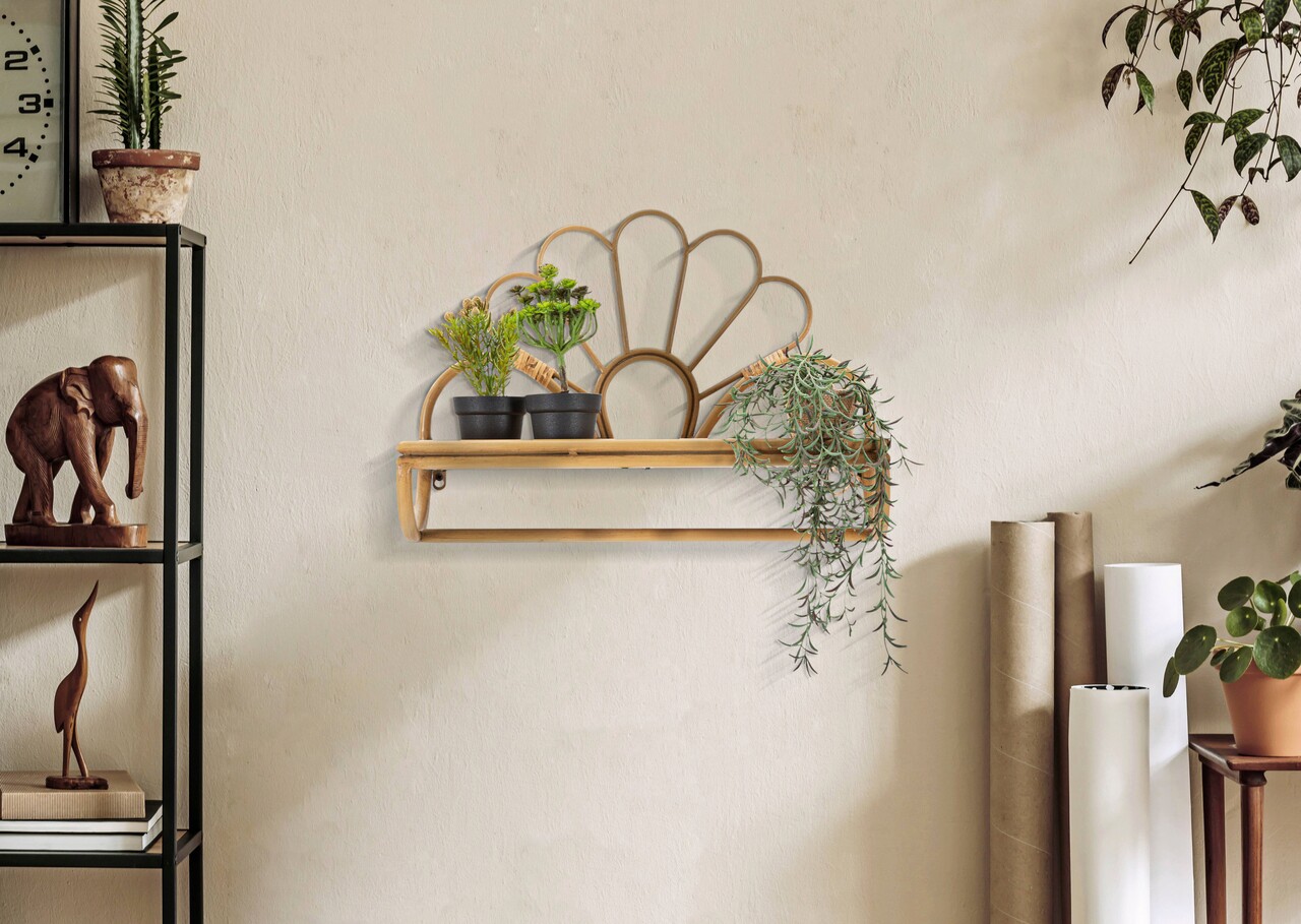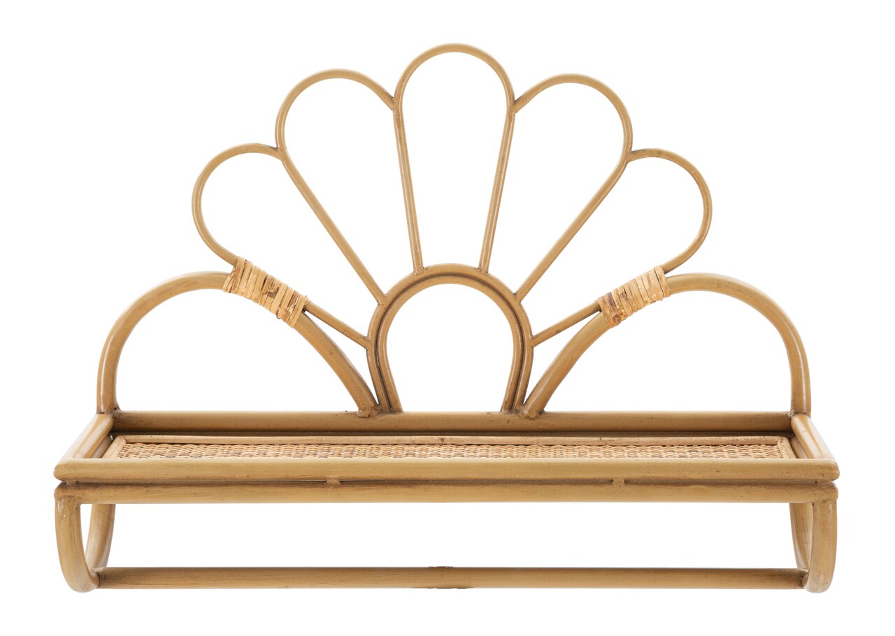 Raft de perete din metal si ratan. Prelucrarea blatului aminteste de impletitura venetiana, iar designul general face trimitere la o floare. Este completat cu o bara in partea inferioara, care poate fi folosita ca umeras pentru haine.