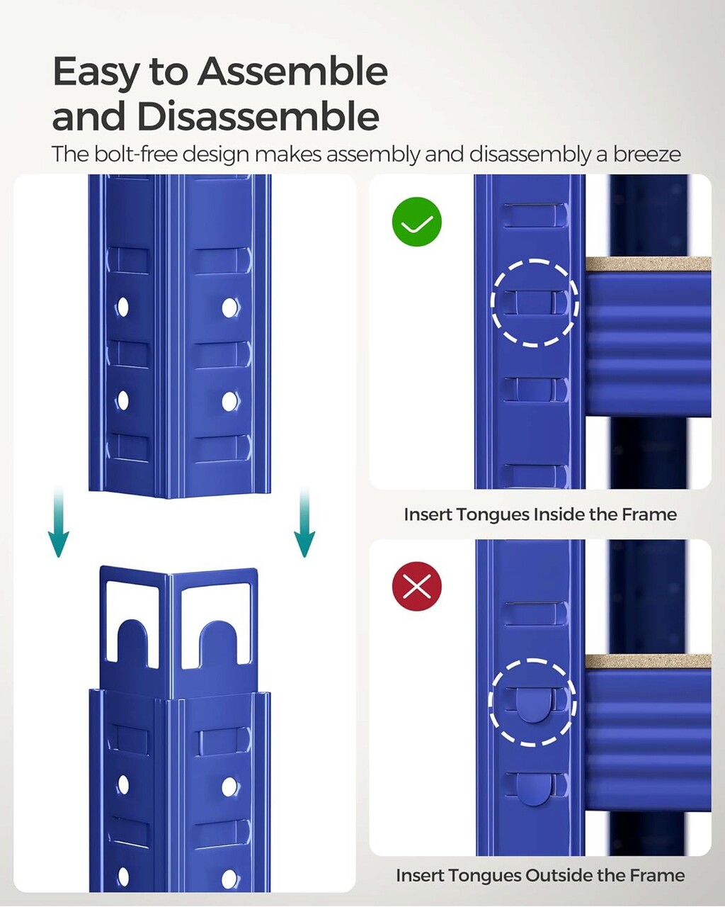 Asamblare usoara Cu un design cu interblocare si instructiuni clare, aceasta unitate de rafturi de mare rezistenta este usor de asamblat si nu necesita unelte.