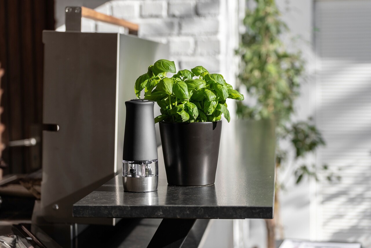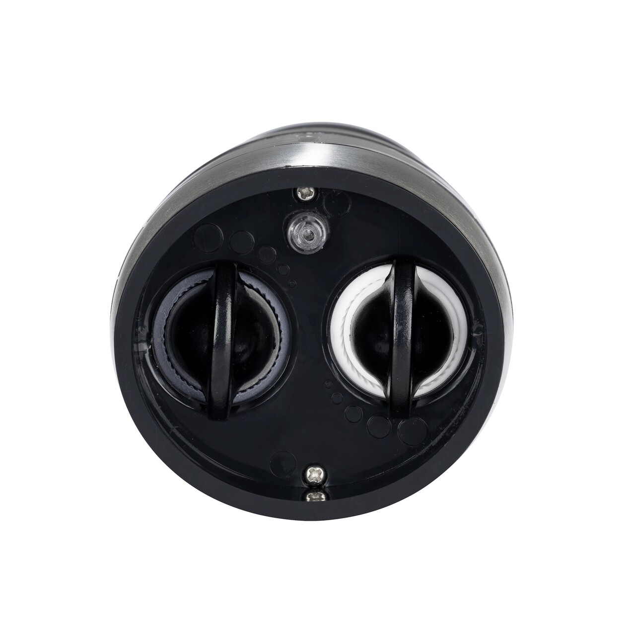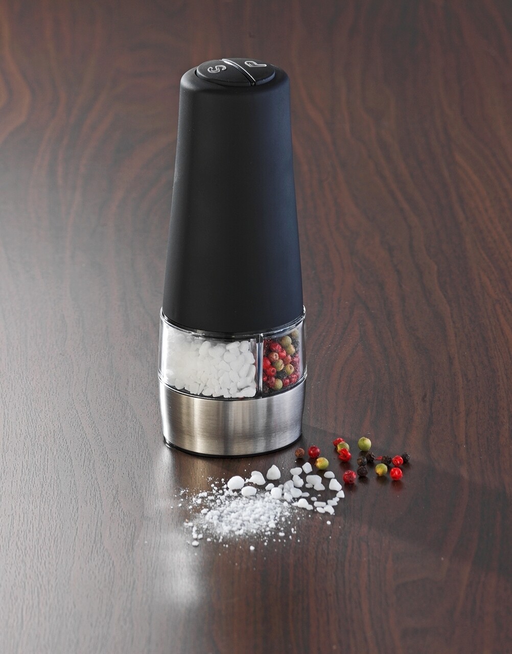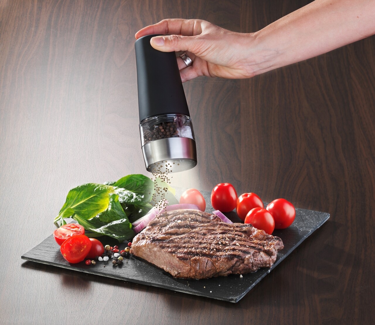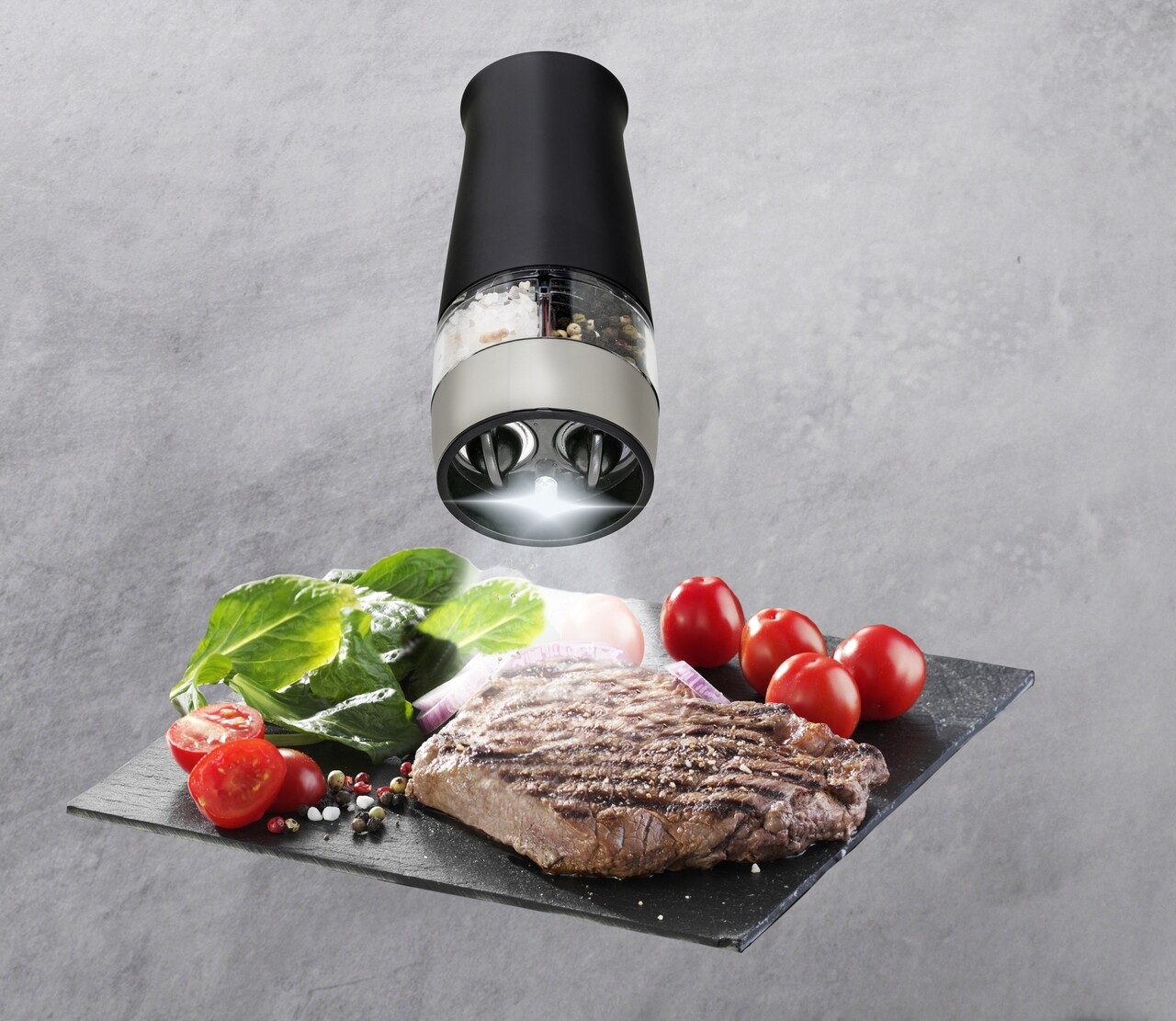Rasnita electrica pentru sare si piper 2 in 1, Wenko, cu LED, 6 x 7 x 17.5 cm, inox/plastic/ceramica, negru/transparent