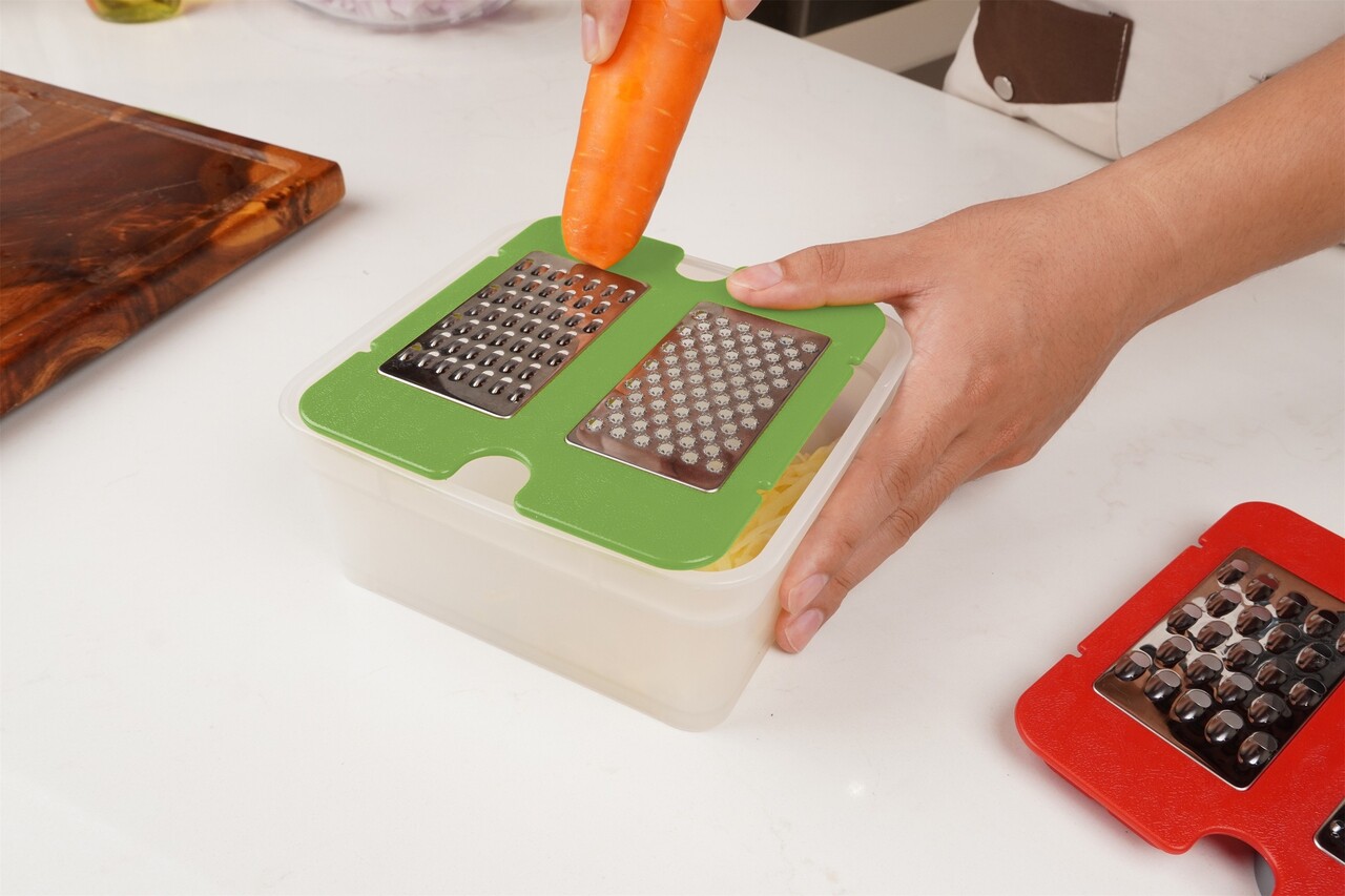Setul pentru razuire include 2 razatori, Cu lame din inox si rame din plastic, Ce pot razui legume cu 4 consistente diferite, De la grosier pana la fin.Pozitionati razatoarea dorita deasupra recipientului din plastic si razuiti dupa preferinte legume, Parmezan, Ciocolata sau altele.