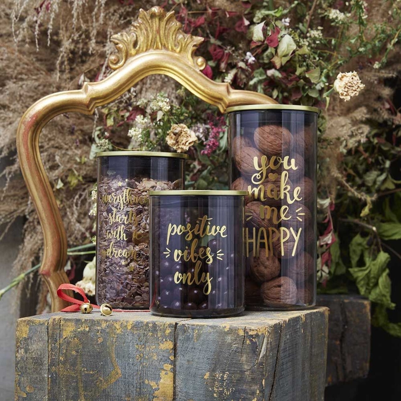 Borcan elegant pentru depozitare, din sticla rezistenta, cu insertii aurii si capac. Acesta poate avea rol functional sau decorativ.