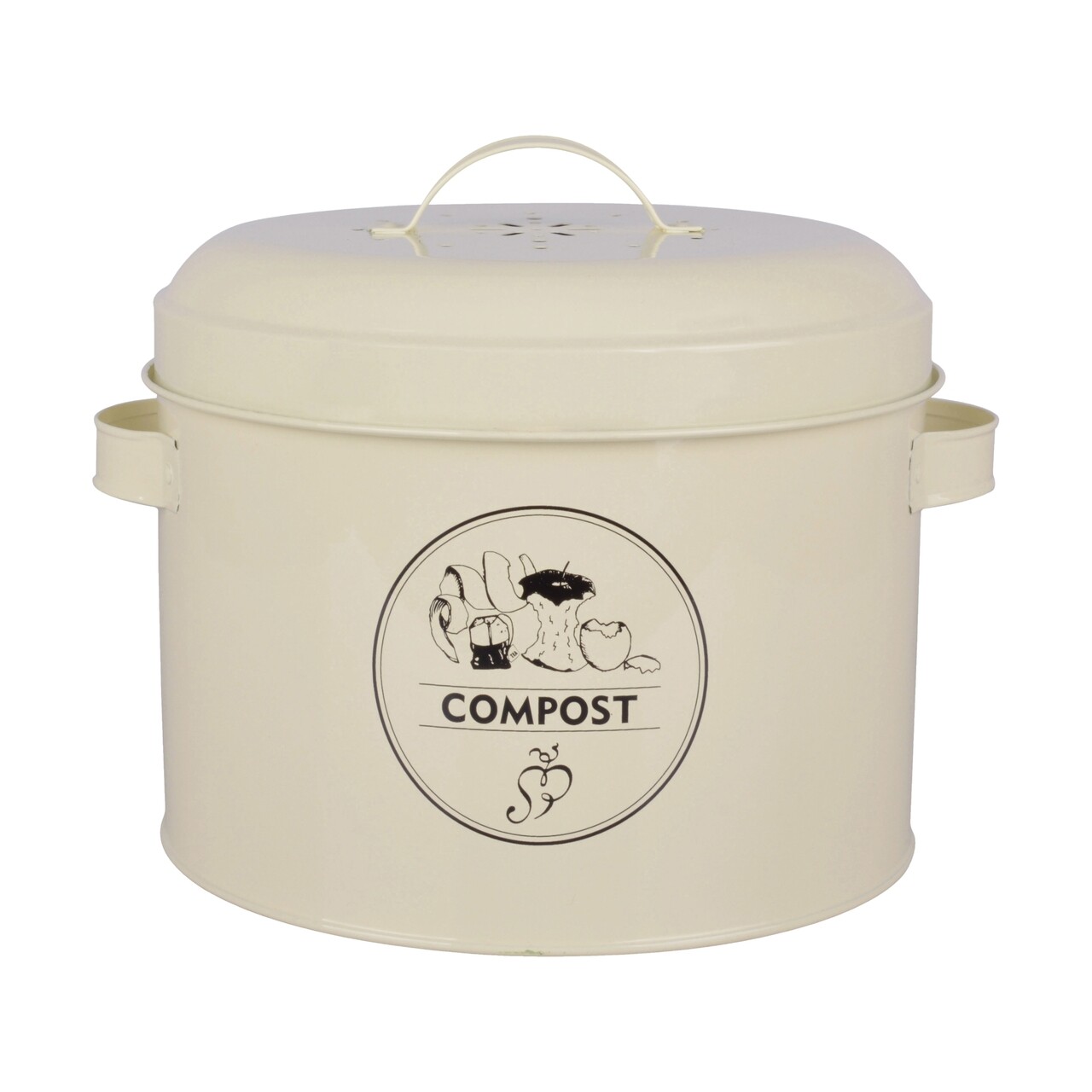 Recipient cu capac pentru compost, Esschert, 23.2 x 27 x 21.3 cm, 6.3 L, otel carbon, crem/negru