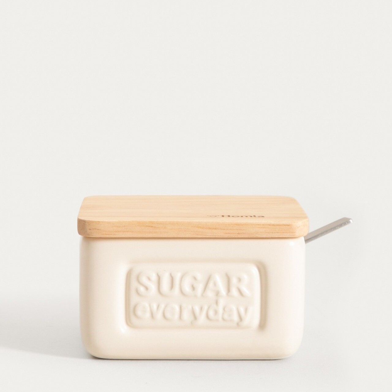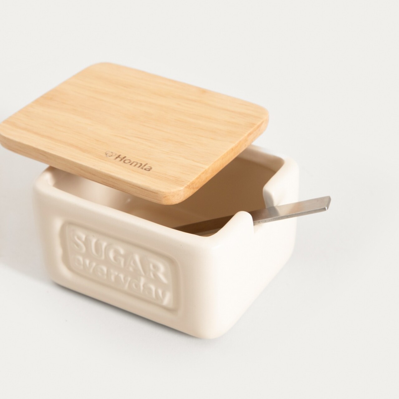 Recipient cu capac pentru zahar Sylan, Homla, 10x8x7 cm, ceramica/lemn, crem/natur