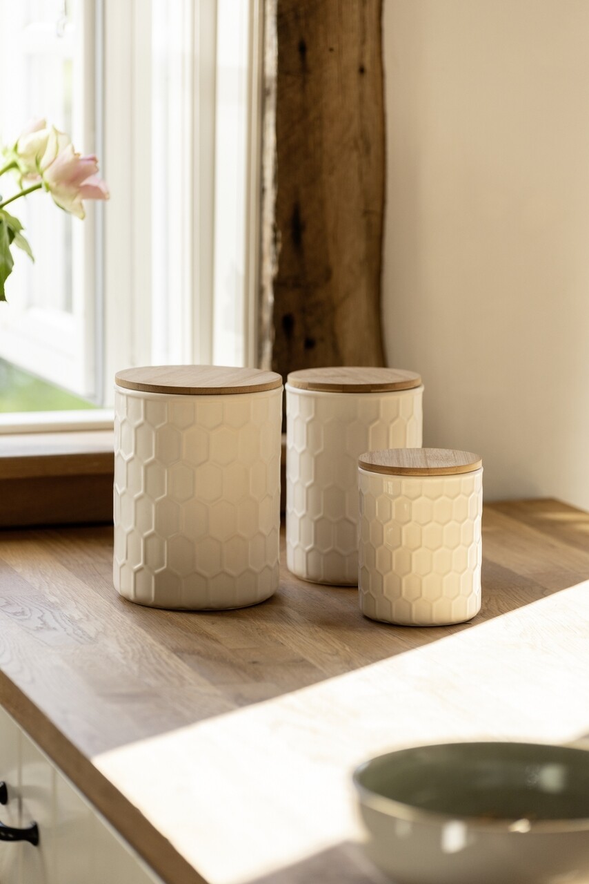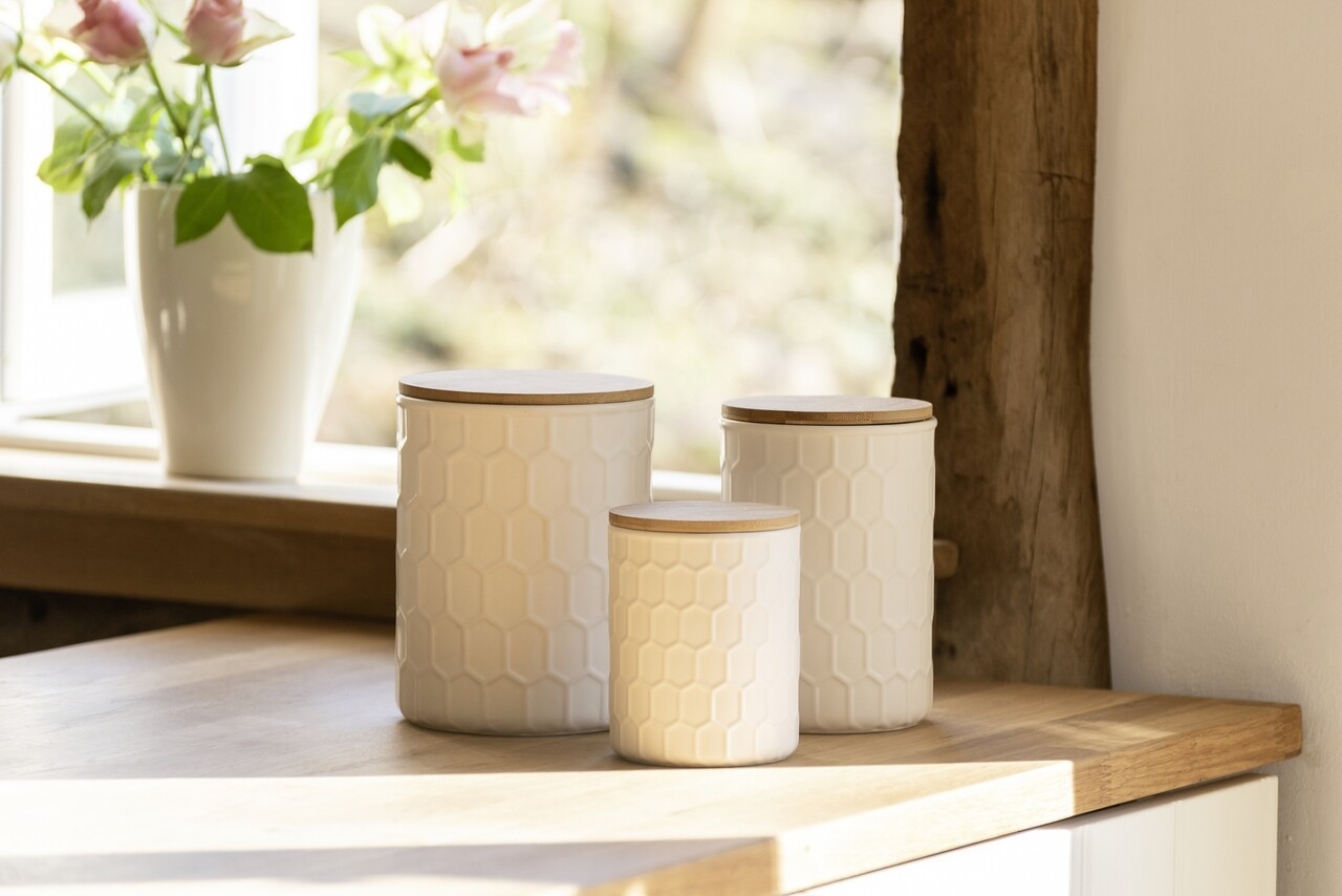 Recipient depozitare cu capac, Wenko, Maya, 0.9 L, 11 x 16 x 11 cm, ceramica/bambus