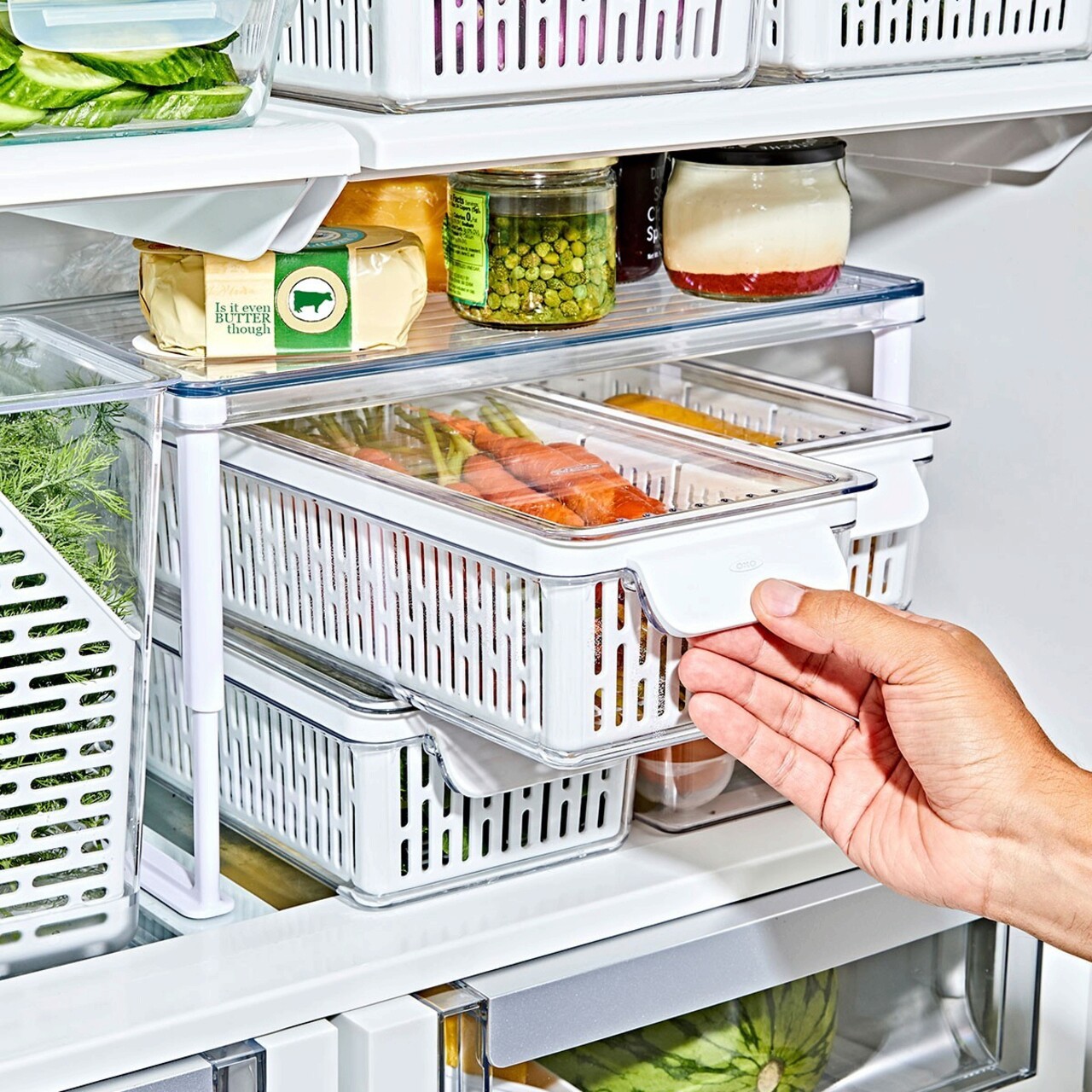 Recipientul pentru frigider, MarcaOXOGood Grips este conceput pentru a pastra proaspete si organizate legumele lungi, Precum morcovii, Castravetii si telina.