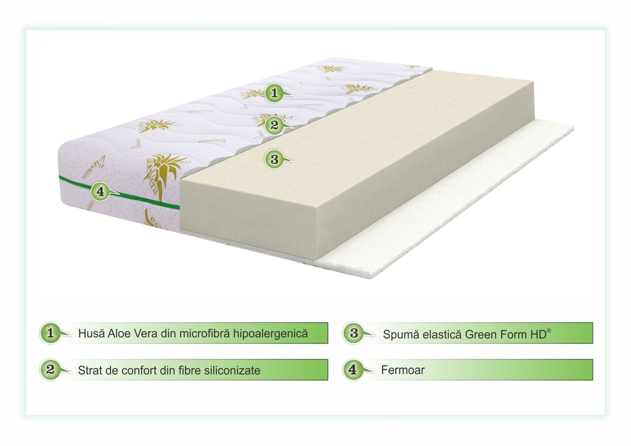 Baza saltelei din spuma elastica Green Form HD in combinatie cu un strat generos de fibre siliconice asigura o sustinere anatomica a corpului si o pozitie corecta a coloanei, fara dureri de spate in timpul somnului.