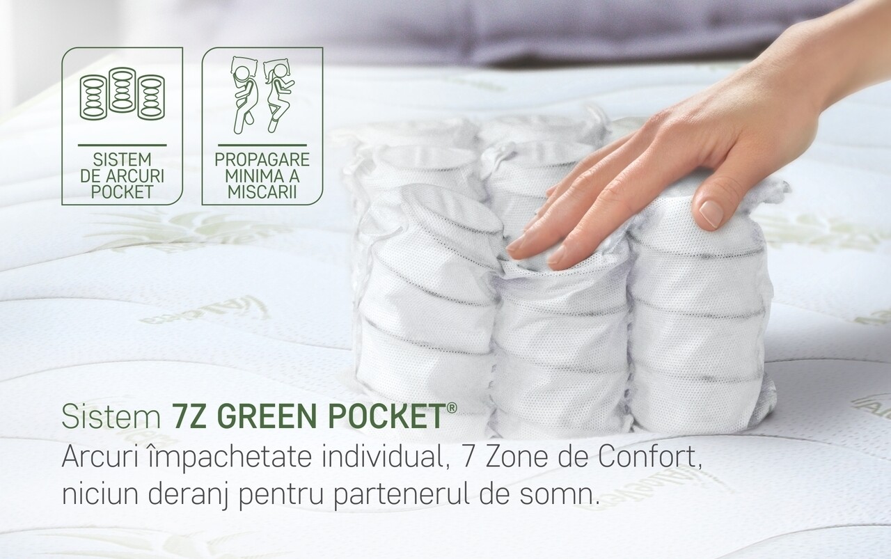 Arcurile sunt impachetate individual in casete de textile si actioneaza independent la presiunea exercitata asupra lor mulandu-se astfel perfect anatomic pe corp. Nevand legaturi intre ele nu angreneaza in miscare celelalte arcuri oferind stabilitate ridicata si zero deranj pentru partenerul de somn. In plus sistemul 7Z Green Pocket® permite un suport diferit al partilor corpului in functie de presiunea exercitata de acestea pe suprafata saltelei pentru a asigura o aliniere corecta si sanatoasa a vertebrelor coloanei.