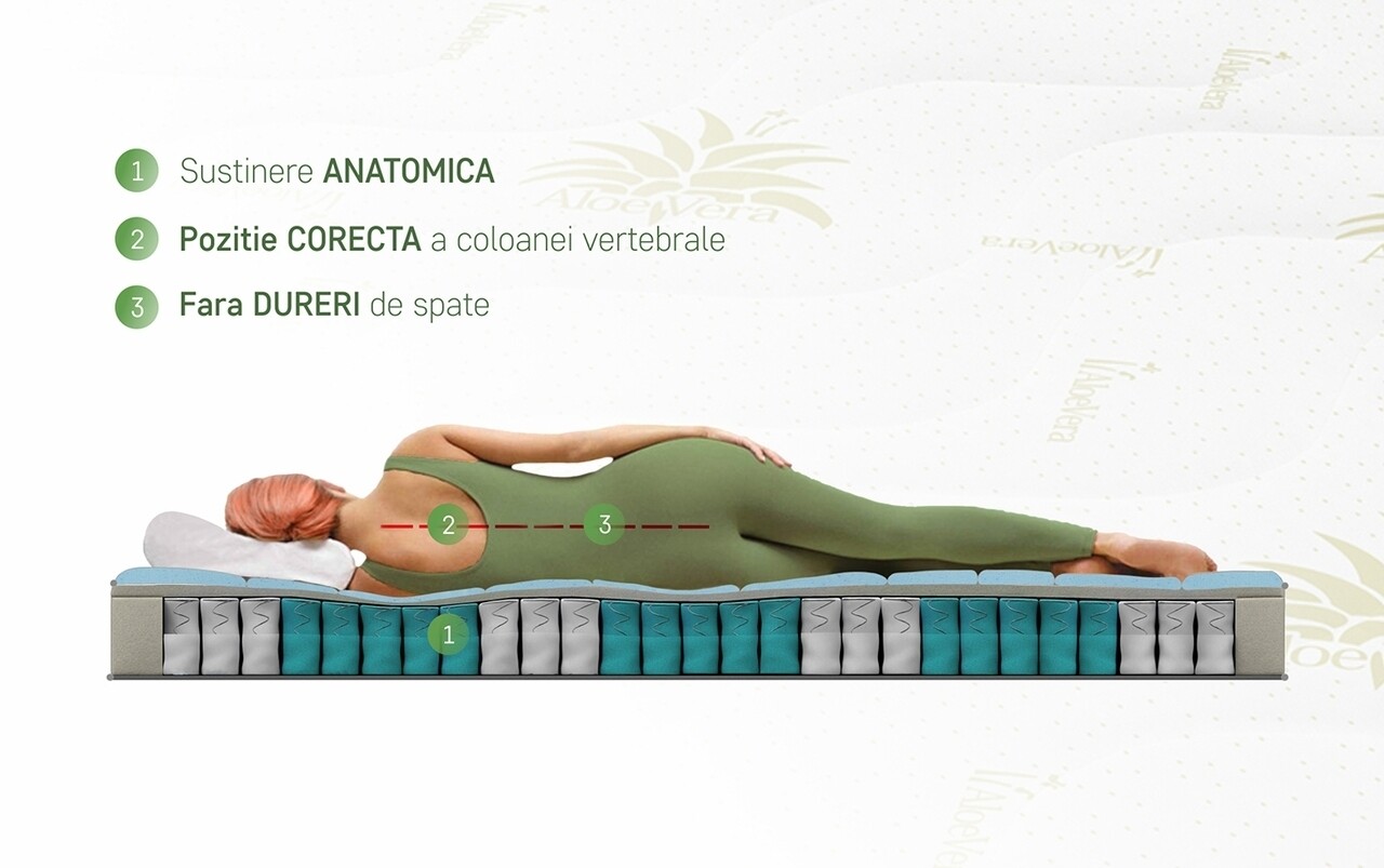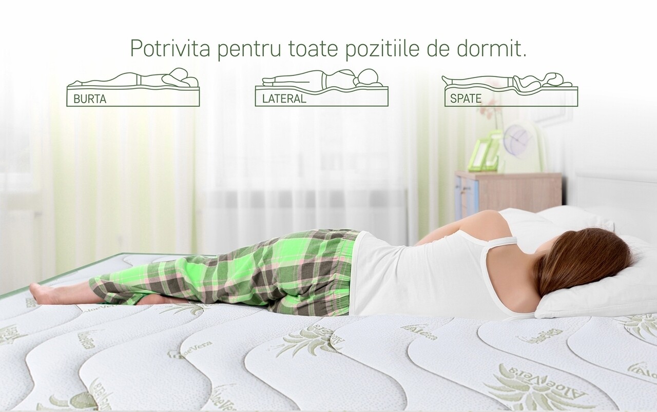 Salteaua Aloe Vera Memory Pocket 7 Zone este o saltea recomandata pentru toate pozitiile de dormit: pe spate, pe lateral si pe stomac.