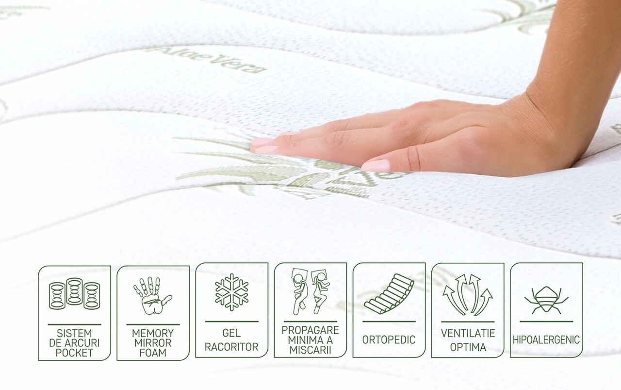 Salteaua Aloe Vera Memory Pocket 7 Zone imbina tehnologia arcurilor impachetate individual tip Pocket cu cele termice ale spumei Green Therm Memory cu particule reci Arctic Gel® si proprietatile anti-inflamatoare binecunoscute ale extractului de Aloe Vera.