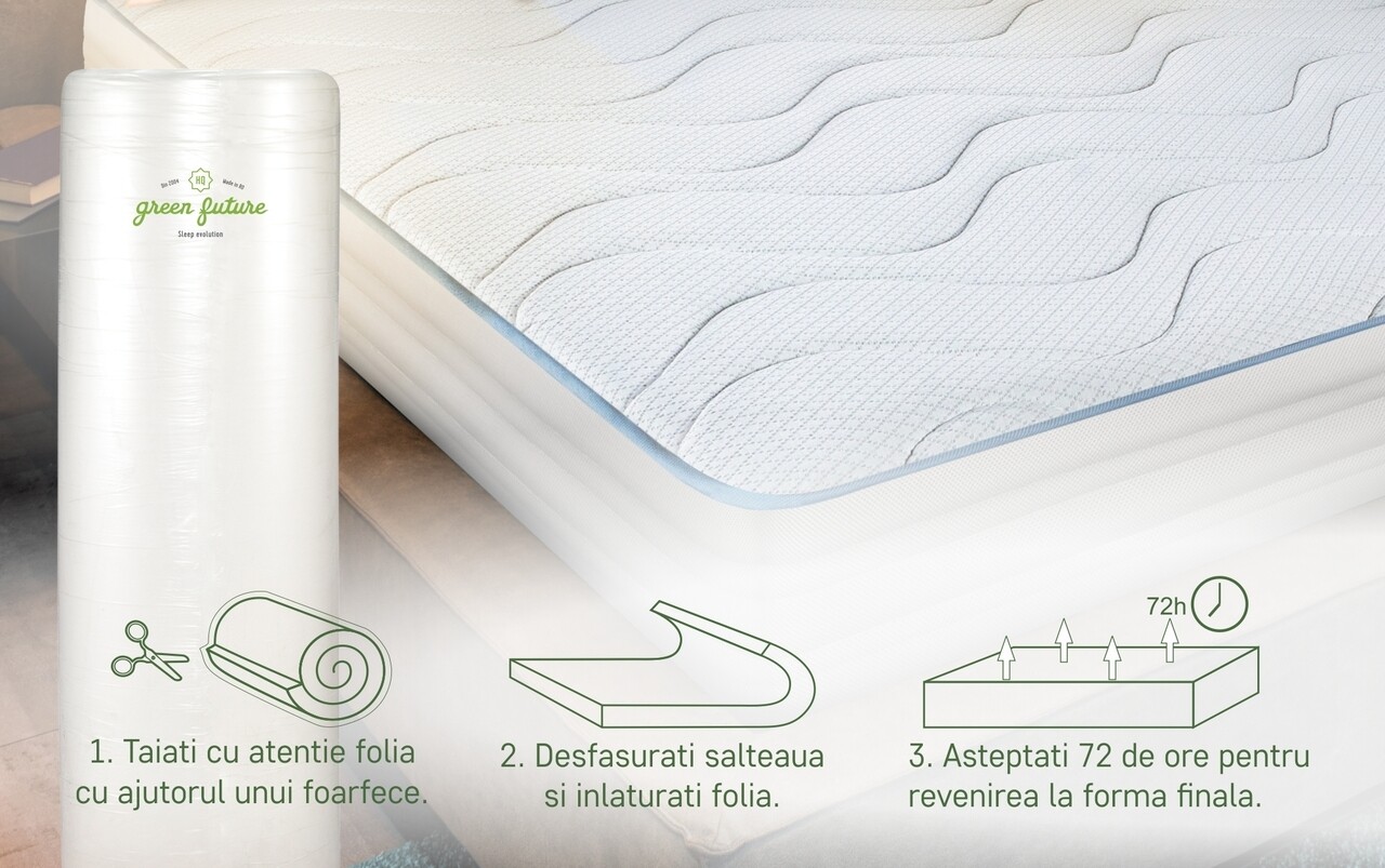 Salteaua este conceputa cu materiale de cea mai buna calitate. Baza saltelei din spuma elastica Green Form HD® cu celulatie deschisa asigura o sustinere anatomica a corpului si o pozitie corecta a coloanei si fara dureri de spate in timpul somnului.